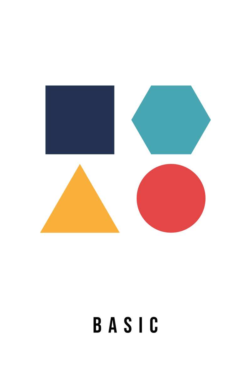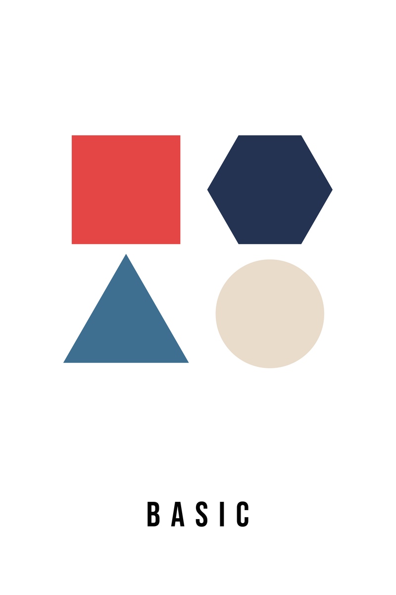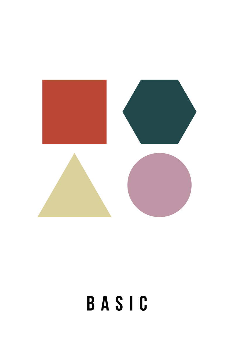 Deze minimalistische poster van 20 x 30 cm toont geometrische basisvormen in vintage kleuren: een roestbruin vierkant, petrol hexagon, een zandkleurige driehoek en een lila cirkel. De warme, gedempte tinten geven het ontwerp een subtiele retro-uitstraling en maken het eenvoudig te combineren met diverse interieurstijlen. Perfect voor een modern interieur of als sfeervolle decoratie in een creatieve ruimte.
