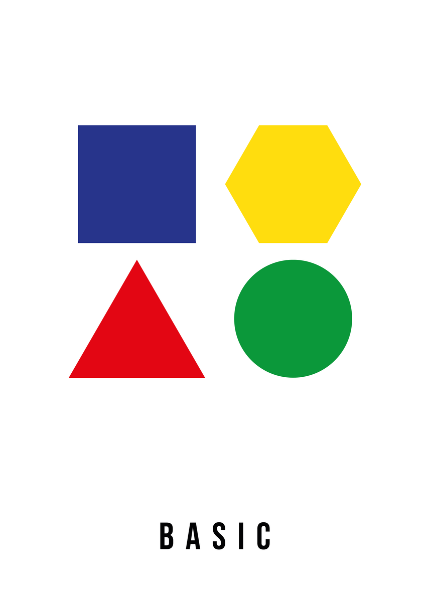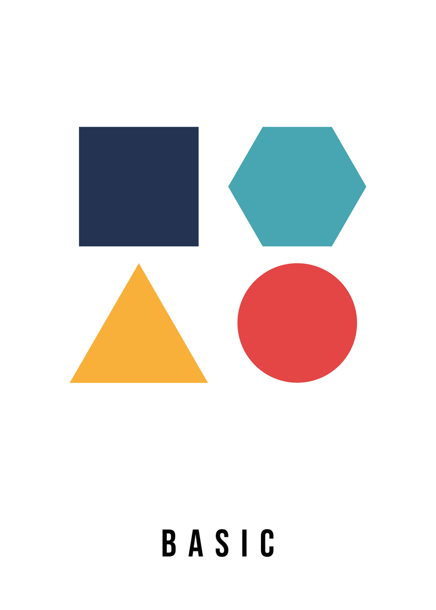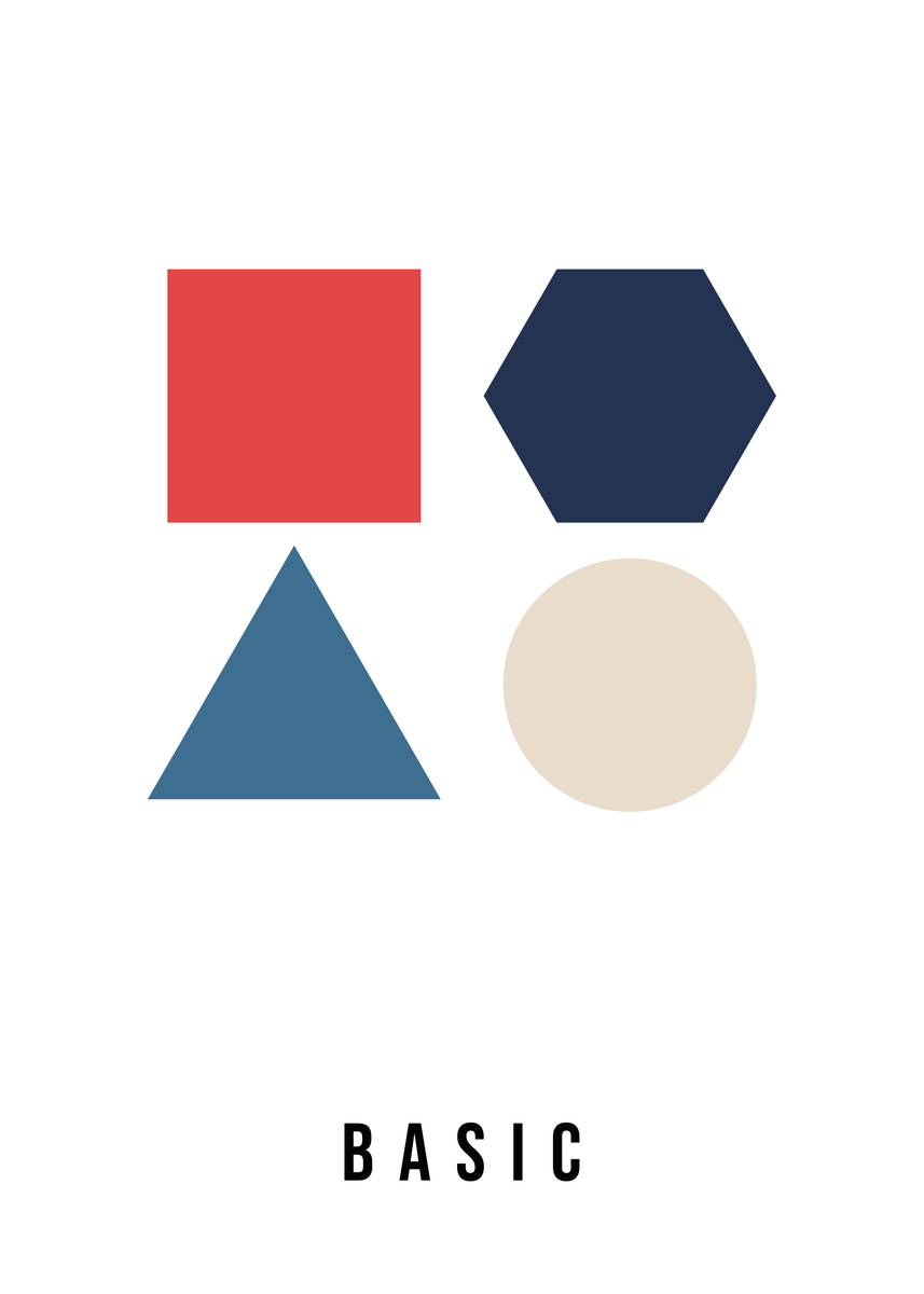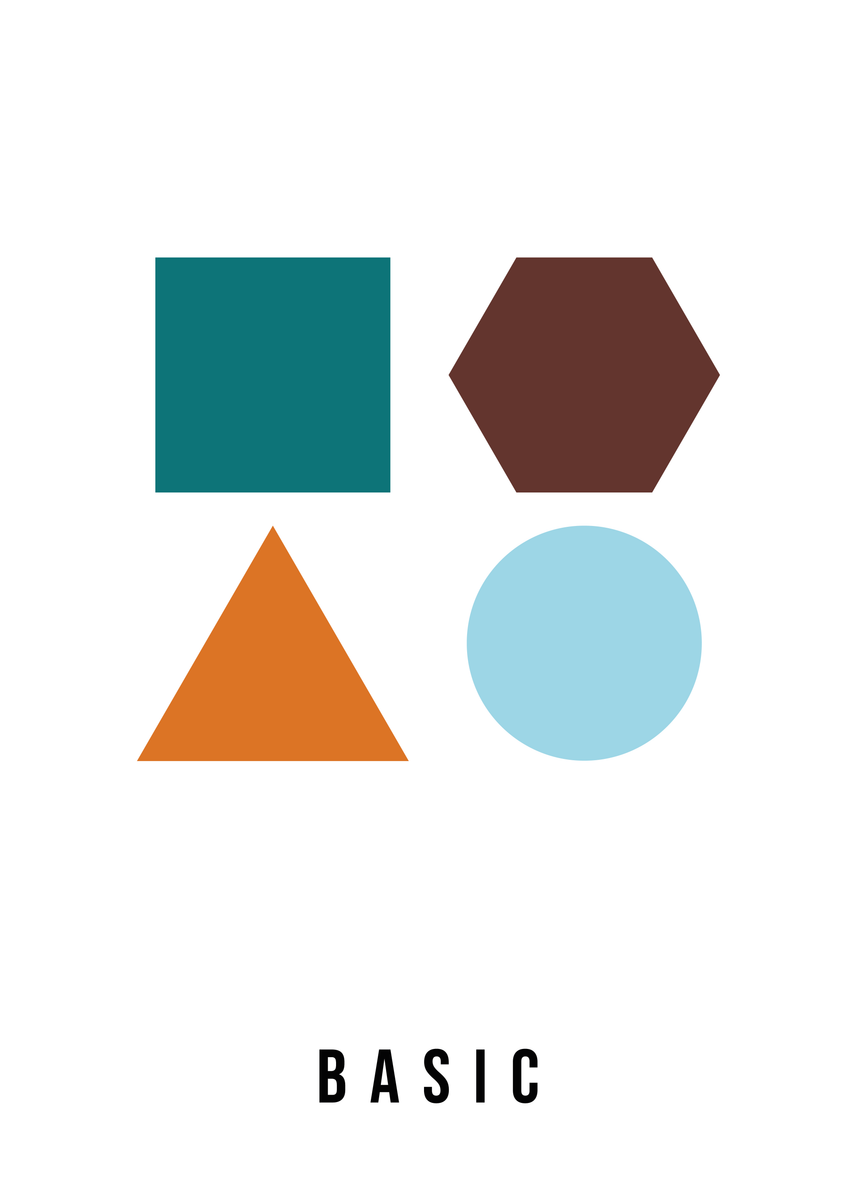 Deze minimalistische poster van 50 x 70 cm toont geometrische basisvormen in vintage kleuren: een roestbruin vierkant, petrol hexagon, een zandkleurige driehoek en een lila cirkel. De warme, gedempte tinten geven het ontwerp een subtiele retro-uitstraling en maken het eenvoudig te combineren met diverse interieurstijlen. Perfect voor een modern interieur of als sfeervolle decoratie in een creatieve ruimte.