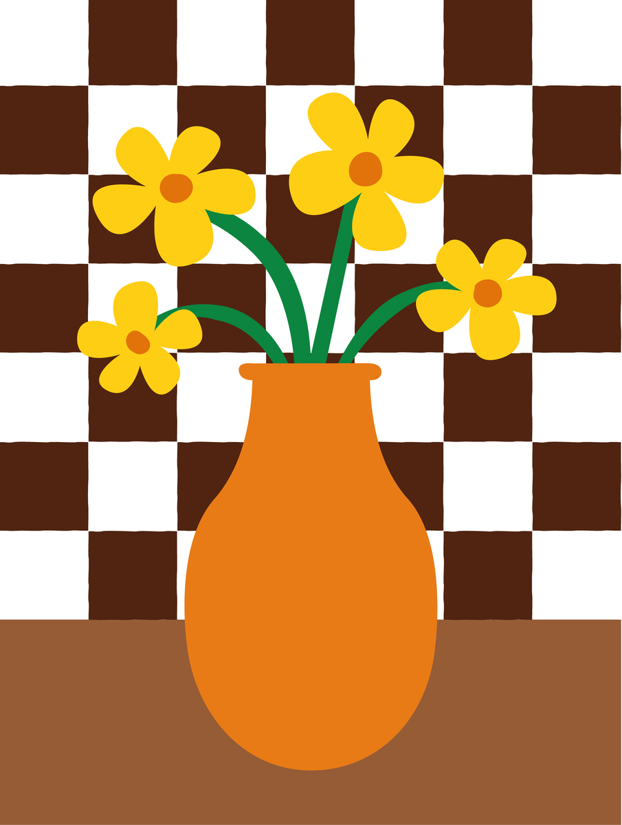 Kleuren brengen sfeer en persoonlijkheid in je interieur! Dit retro-geïnspireerde ontwerp van 30 x 40 cm heeft een opvallend kleurenpalet met sterke contrasten. Een lichtblauwe vaas, met daarin vier gele bloemen met groene stelen, wordt geplaatst op een roze ondergrond. De zwart-wit geblokte tegelmuur op de achtergrond geeft het ontwerp een vintage gevoel. Het ontwerp is dé kleurrijke toevoeging die jouw eclectische of retro interieur kan gebruiken.