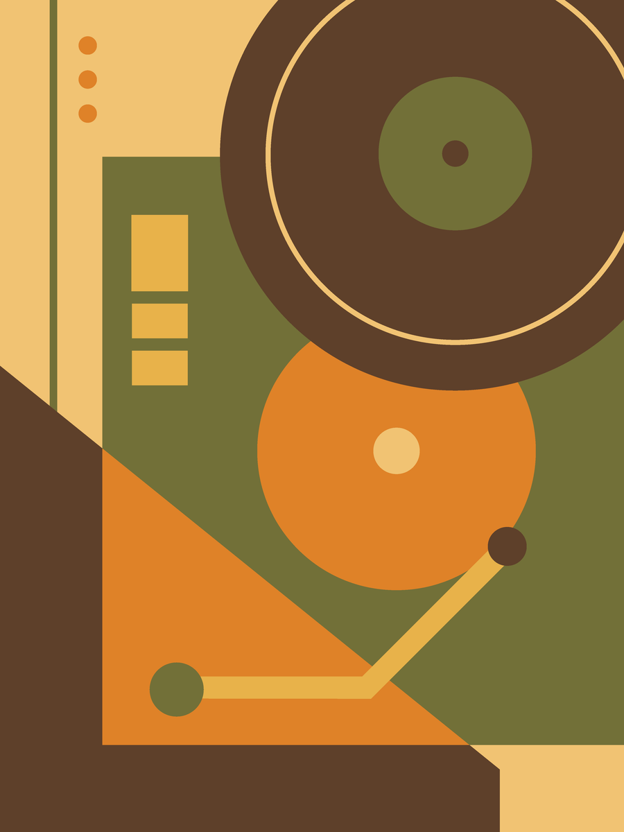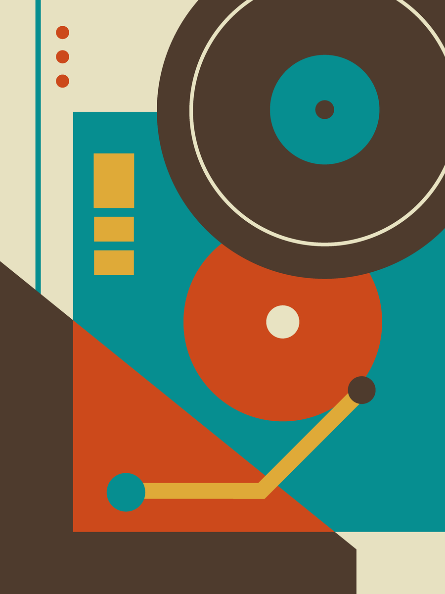 Breng een vleugje retro in huis met deze 30 x 40 cm aluminium plaat! De grafische weergave van een platenspeler in blauw, bordeauxrood, rood, okergeel en oranje geeft je interieur een vintage uitstraling met een moderne twist. Perfect voor je muziekhoekje of om boven je platenspeler te hangen.