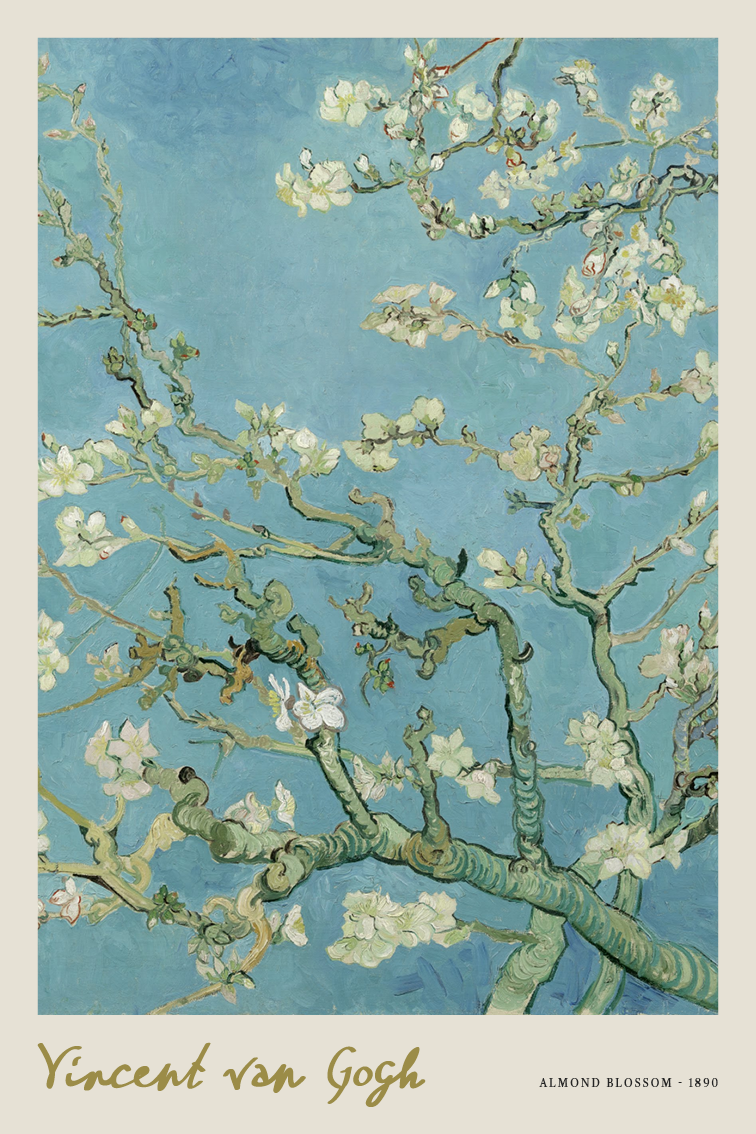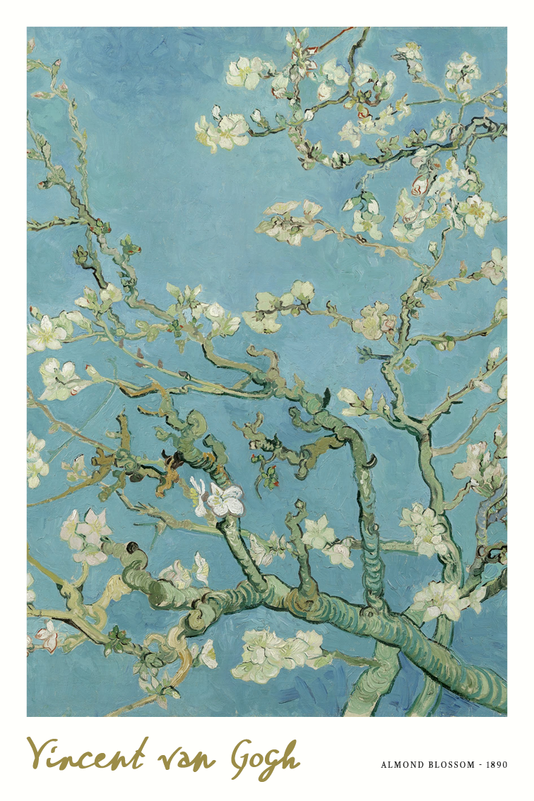 Deze poster van 20 x 30 cm toont het iconische werk Amandelbloesem van Vincent van Gogh, dat hij schilderde ter gelegenheid van de geboorte van zijn neefje. De bloesemtakken met witte bloemen steken sierlijk af tegen een helderblauwe lucht. De diepgroene takken geven het geheel een levendige uitstraling. Onderaan is de handtekening van Van Gogh subtiel in het ontwerp verwerkt, wat zorgt voor een extra detail. Rond het ontwerp is er een zwarte rand toegevoegd.