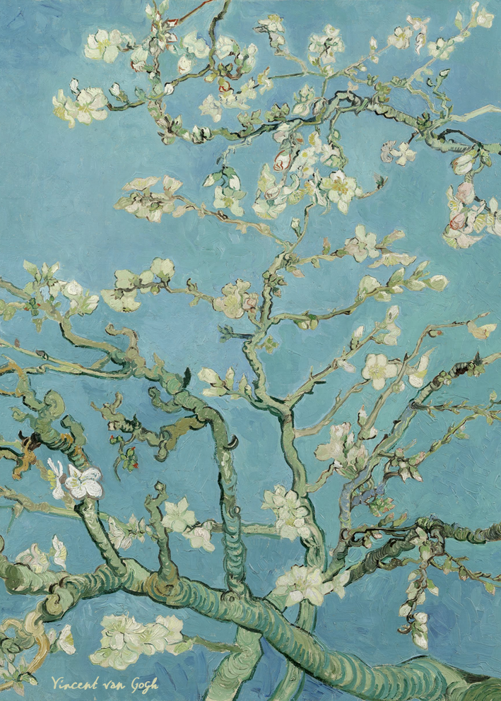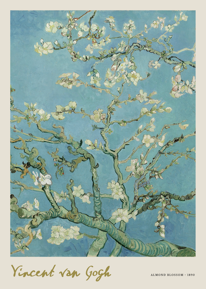 Deze poster van 50 x 70 cm toont het iconische werk Amandelbloesem van Vincent van Gogh, dat hij schilderde ter gelegenheid van de geboorte van zijn neefje. De bloesemtakken met witte bloemen steken sierlijk af tegen een helderblauwe lucht. De diepgroene takken geven het geheel een levendige uitstraling. Onderaan is de handtekening van Van Gogh subtiel in het ontwerp verwerkt, wat zorgt voor een extra detail. Rond het ontwerp is er een zwarte rand toegevoegd.