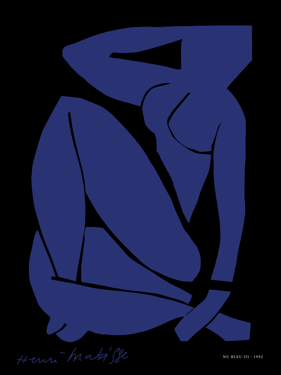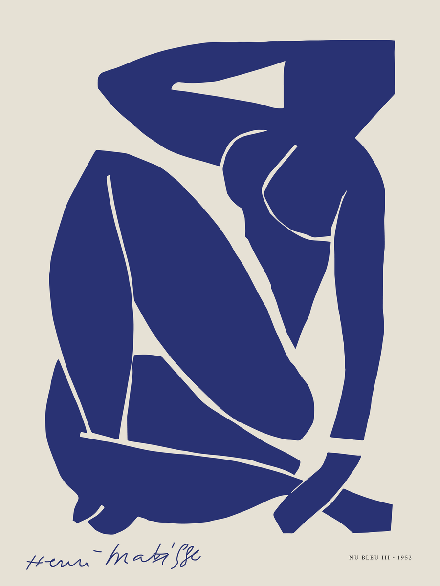Een visueel statement dat laat zien hoe krachtig minimalisme kan zijn! Deze poster van 30 x 40 cm toont Blue Nude III (1952) van Henri Matisse: een abstract beeld van een zittende vrouw, opgebouwd uit diepblauwe vormen. De compositie is onderdeel van Matisse’ beroemde knipkunst serie. Onderaan het ontwerp is zijn handtekening subtiel verwerkt.