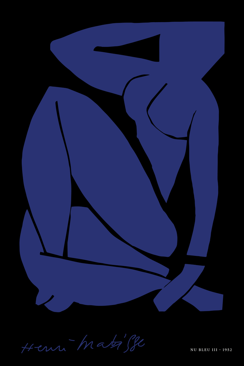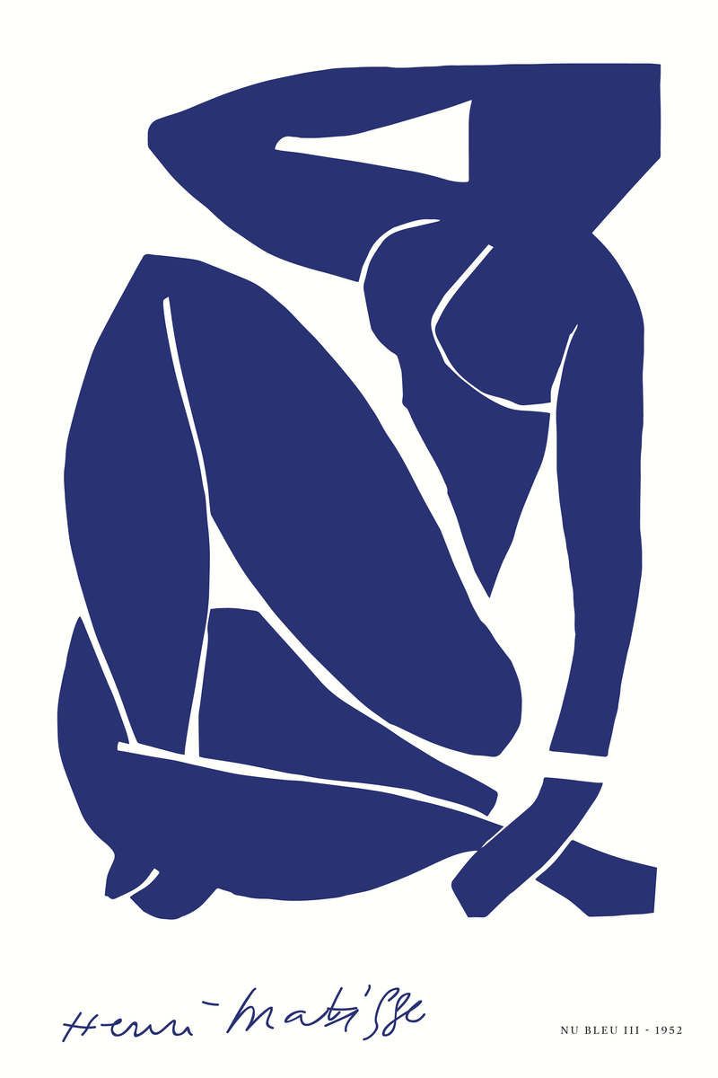 Een visueel statement dat laat zien hoe krachtig minimalisme kan zijn! Deze poster van 20 x 30 cm toont Blue Nude III (1952) van Henri Matisse: een abstract beeld van een zittende vrouw, opgebouwd uit diepblauwe vormen op een beige achtergrond. De compositie is onderdeel van Matisse’ beroemde knipkunst serie. Onderaan het ontwerp is zijn handtekening subtiel verwerkt.