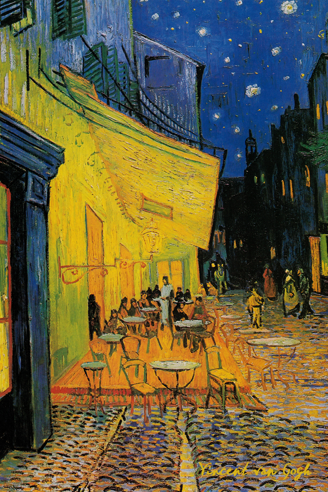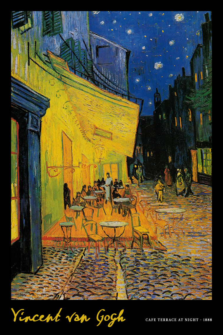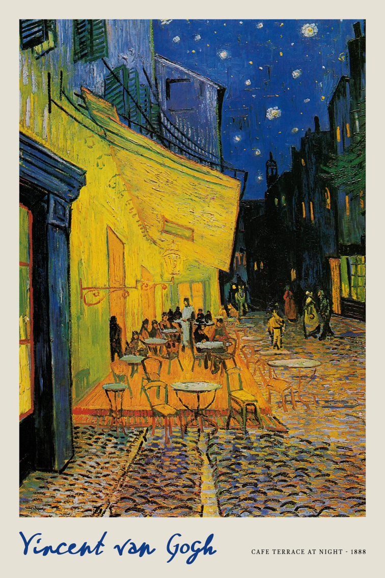 Deze poster van 20 x 30 cm toont Café Terrace at Night van Vincent van Gogh uit 1888. Aan de onderkant van het ontwerp is de originele handtekening van deze meester toegevoegd. In het werk zie je een levendig terras onder een sprankelende sterrenhemel, met het felgele café als stralend middelpunt. De kasseien op de voorgrond en de donkere gebouwen op de achtergrond zorgen voor contrast en diepte. De warme kleuren en post-impressionistische stijl brengen karakter en sfeer in je interieur. De zacht witte omlijsting maakt het geheel af en geeft het kunstwerk een rustige, stijlvolle uitstraling.