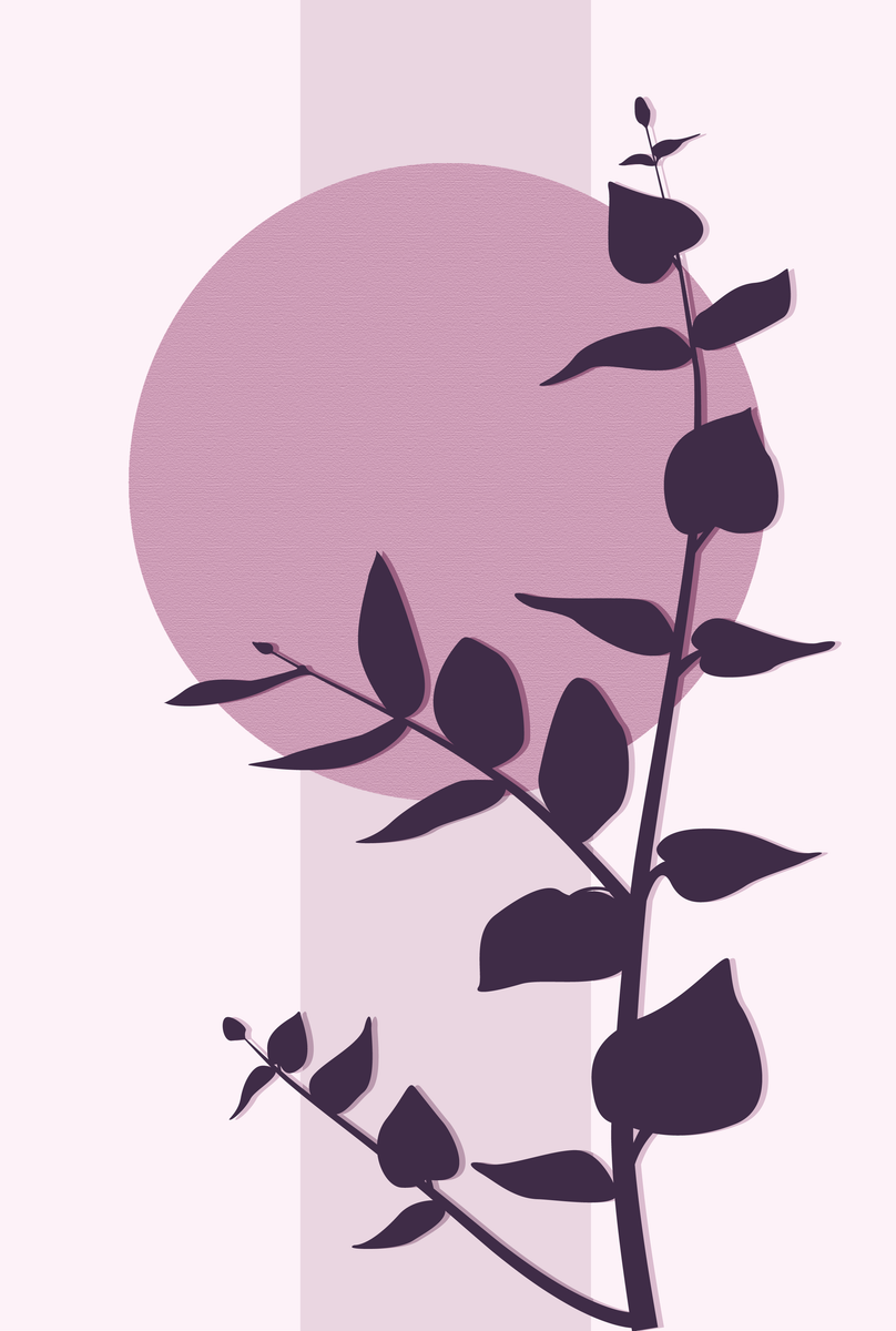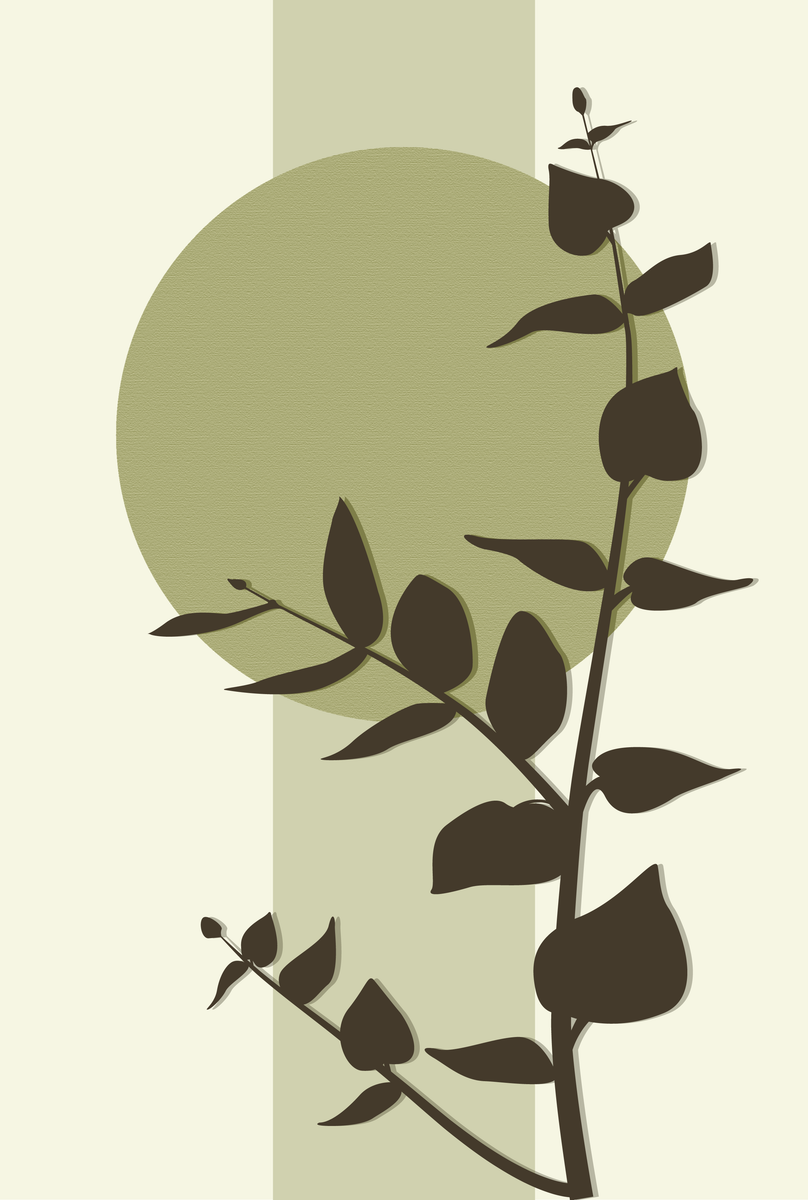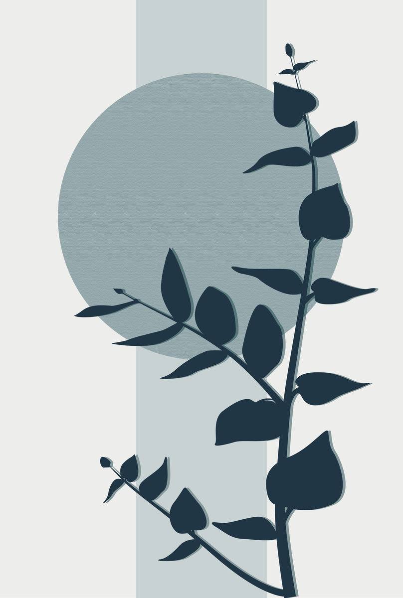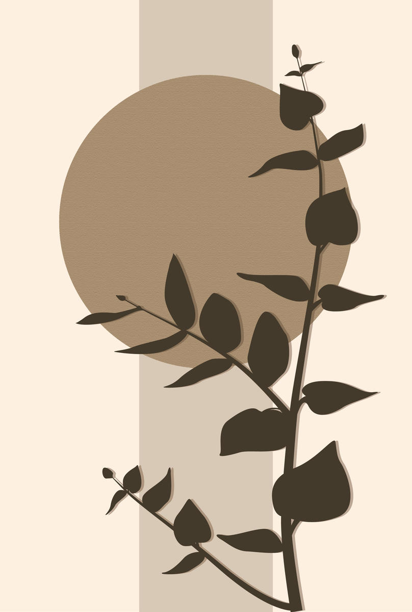 Op deze poster van 20 x 30 cm staat een bruine eucalyptusplant centraal. Achter de plant zijn verschillende oranje vormen te zien, die het ontwerp een gelaagd effect geven. Dankzij de beige achtergrond en het tijdloze ontwerp past deze poster perfect in elk modern of Japans geïnspireerd interieur.