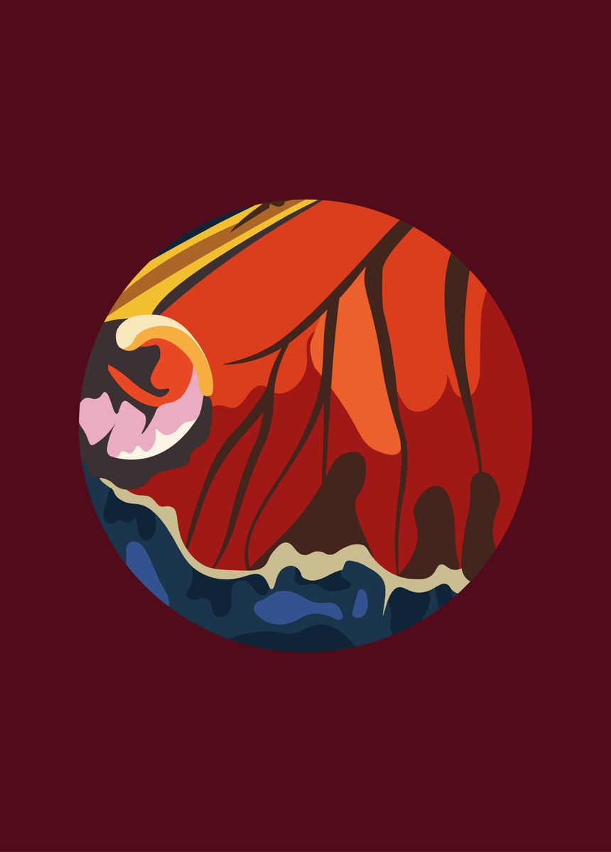 Deze poster van 50 x 70 cm toont een ingezoomde vlindervleugel, alsof je ernaar kijkt door een macrolens. De blauw en groentinten in combinatie met warme kleuren zoals rood en oranje, resulteren in een fleurig geheel. Het ronde, groene kader rondom de vleugel creëert het effect van een lens, waardoor de gedetailleerde patronen en structuren van de vleugel extra opvallen. Dit kunstwerk is perfect voor liefhebbers van organische vormen in moderne kunst.