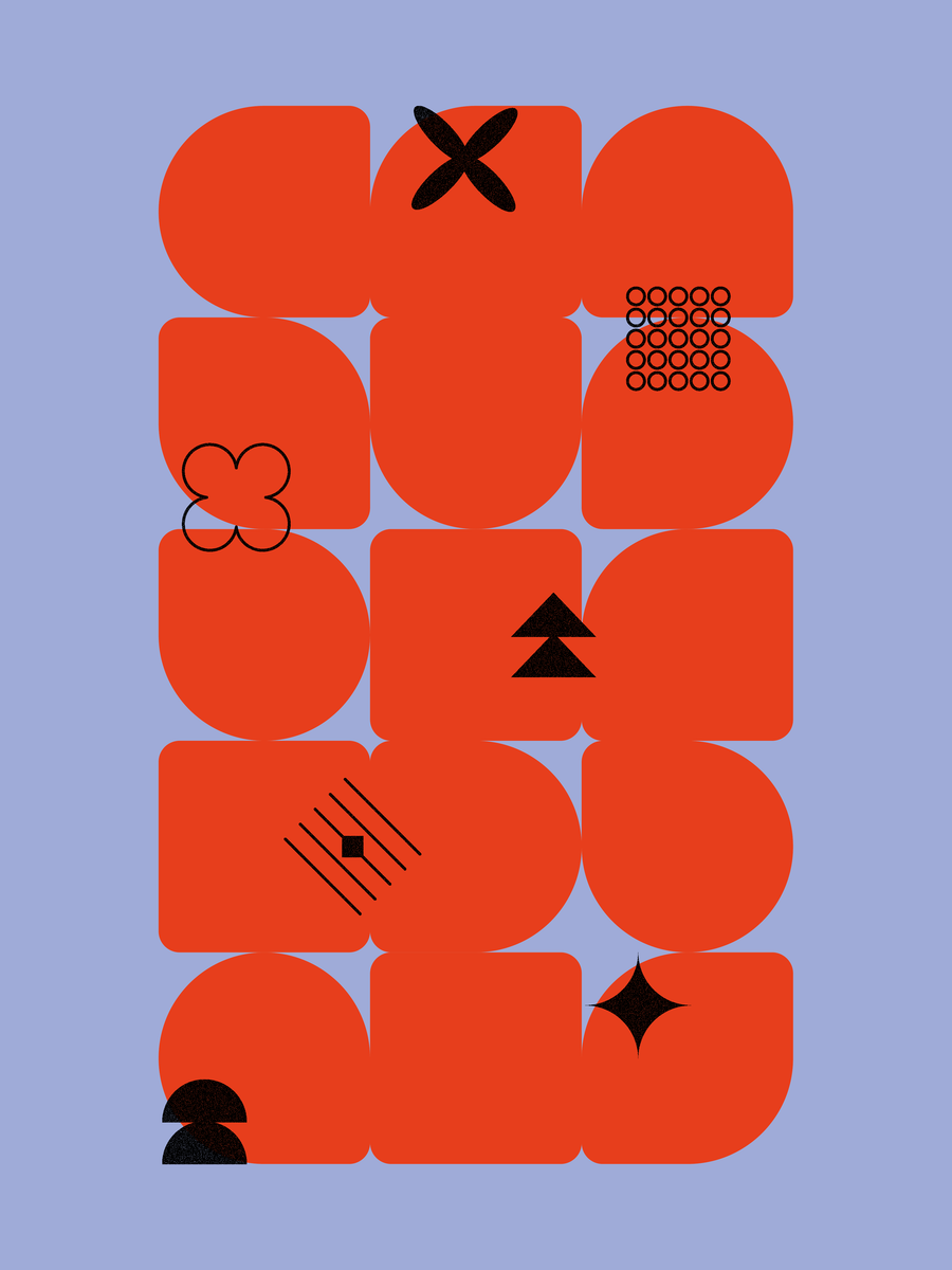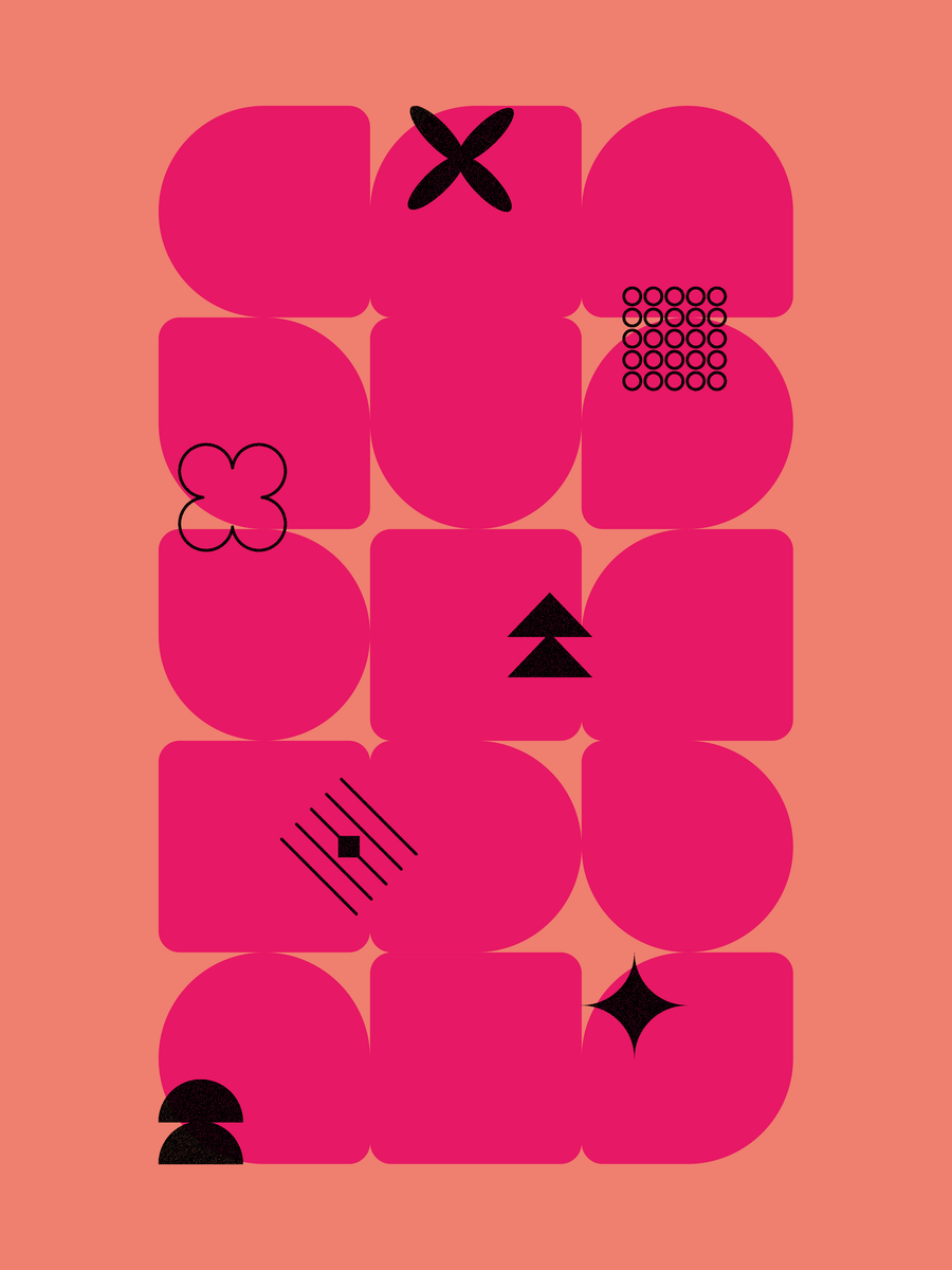 Deze poster van 30 x 40 cm bestaat uit roze geometrische blokken op een rode achtergrond, gecombineerd met zwarte abstracte symbolen. De zwarte elementen hebben een subtiel korrelig effect, wat een uniek detail toevoegt. Verder zorgt de asymmetrische plaatsing van de zwarte elementen ervoor dat het ontwerp aantrekkelijk blijft om naar te kijken. De poster is perfect voor de liefhebbers van abstract en minimalistisch design.