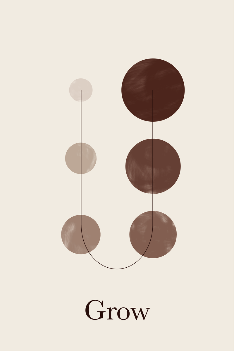 Deze minimalistische 20 x 30 cm poster verbeeldt groei op een beige achtergrond. Een dunne lijn verbindt de cirkels, die geleidelijk in formaat toenemen, van klein naar groot. Tegelijkertijd verandert de kleur van lichtgroen naar donkergroen, wat de overgang nog natuurlijker maakt. Onderaan wordt het ontwerp omschreven met het woord: Grow.