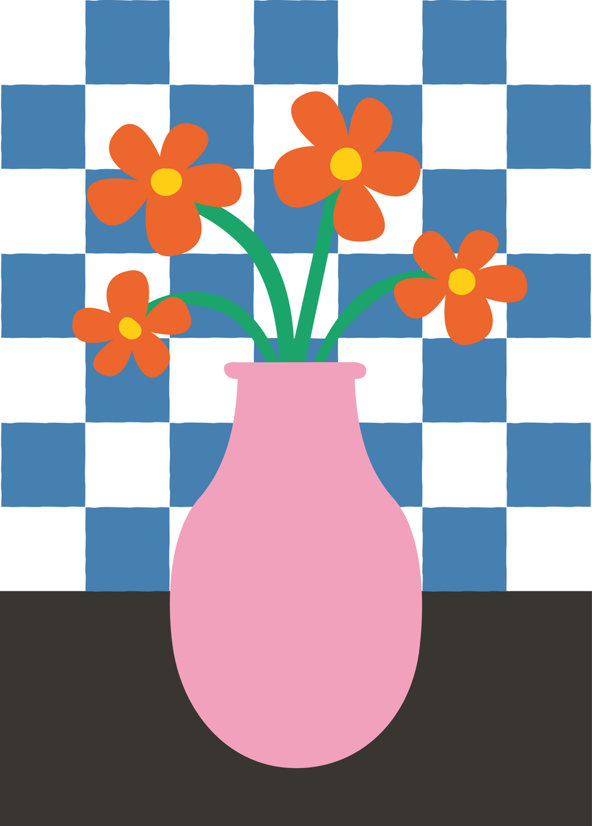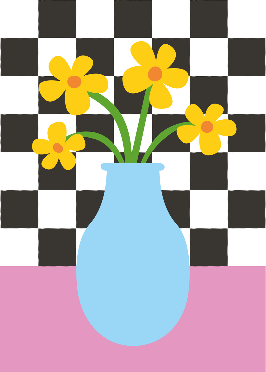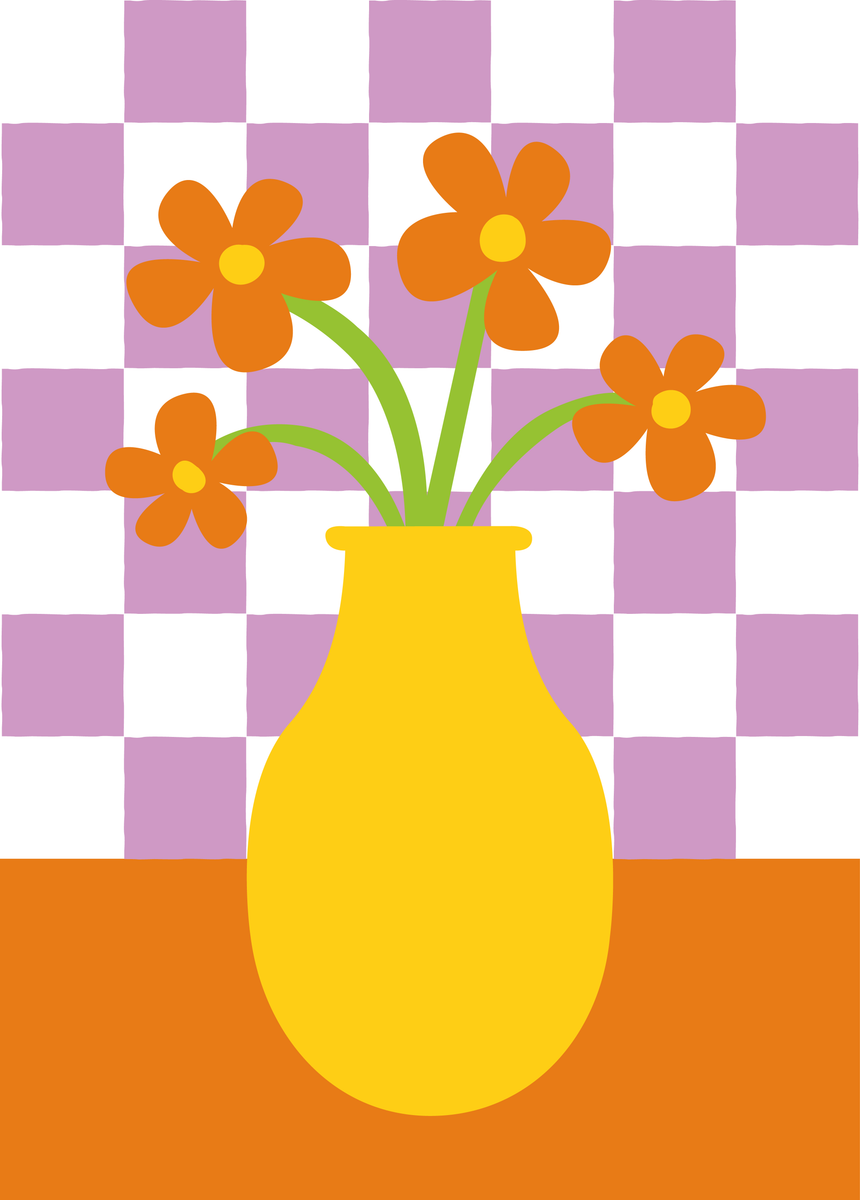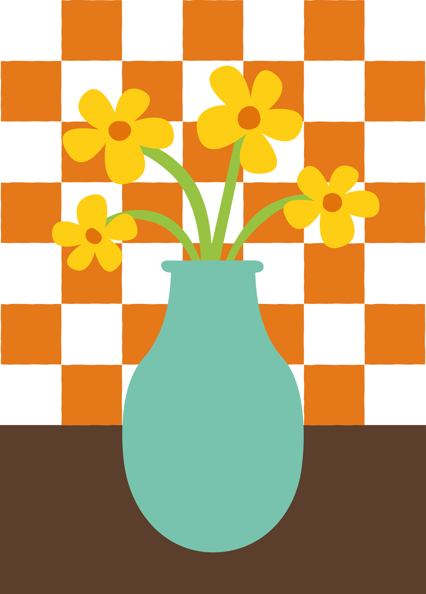 Kleuren brengen sfeer en persoonlijkheid in je interieur! Dit retro-geïnspireerde ontwerp van 50 x 70 cm heeft een opvallend kleurenpalet met sterke contrasten. Een oranje vaas, met daarin vier gele bloemen met groene stelen, wordt geplaatst op een bruine ondergrond. De donkerbruin-wit geblokte tegelmuur op de achtergrond geeft het ontwerp een vintage gevoel. Het ontwerp is dé kleurrijke toevoeging die jouw eclectische of retro interieur kan gebruiken.
