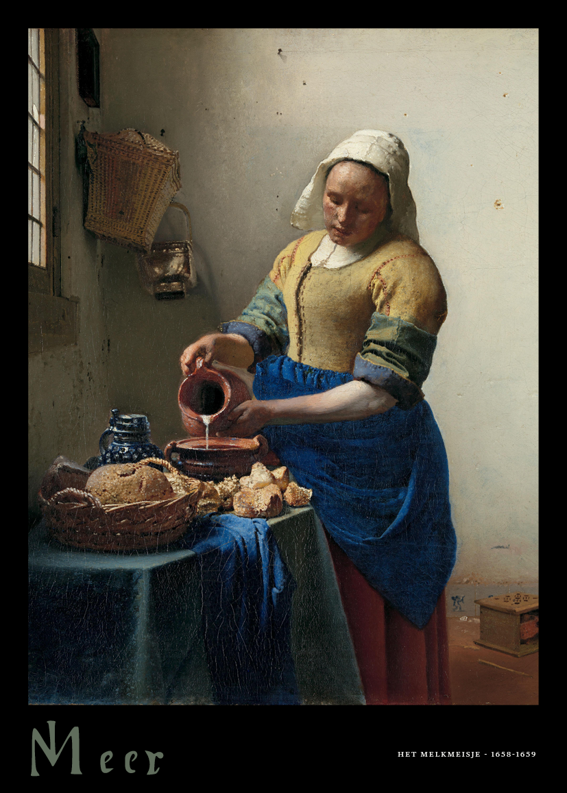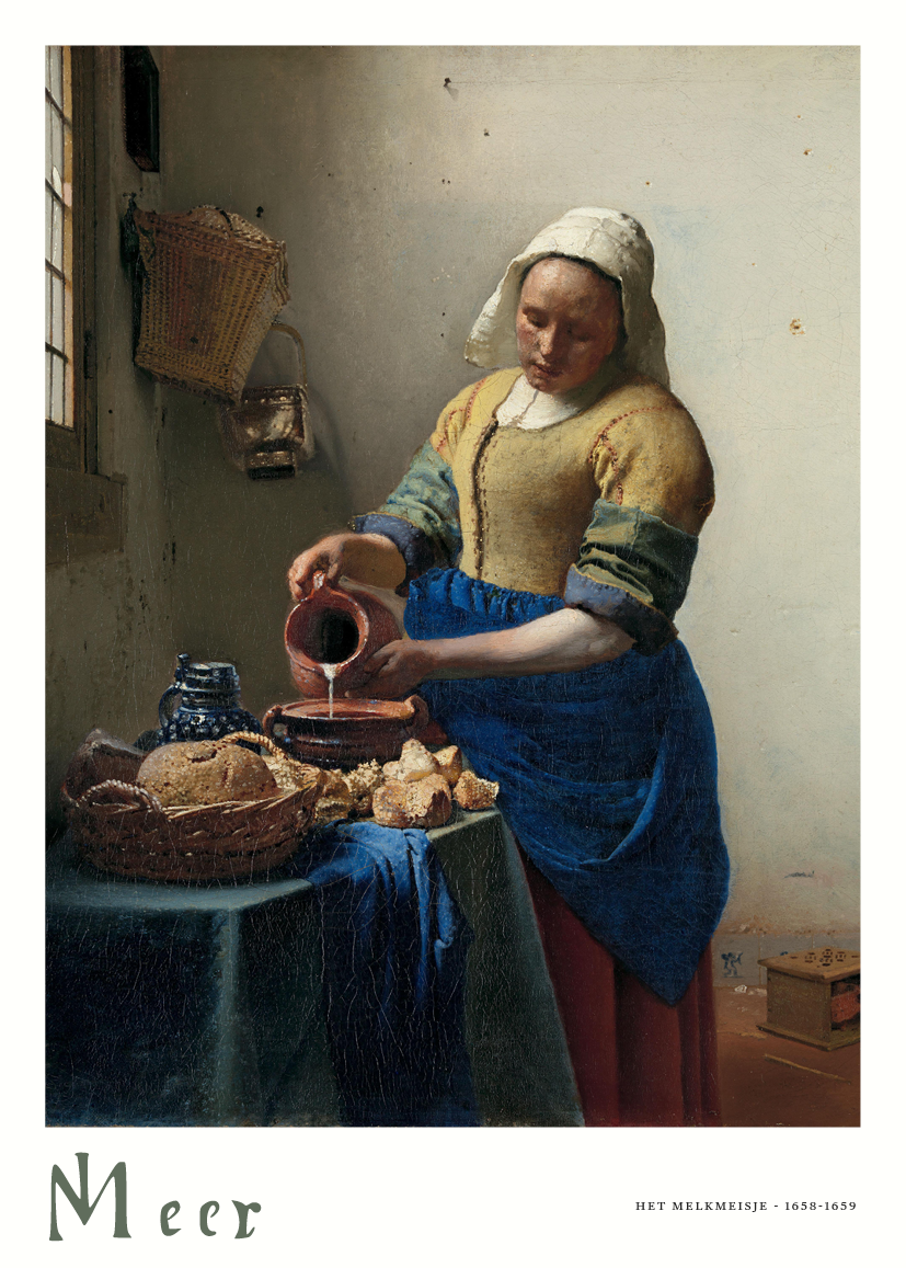 Deze poster van 50 x 70 cm toont Het Melkmeisje van Johannes Vermeer, geschilderd rond 1658-1659. Tijdens het werk schenkt een dienstmeisje melk in een schaal, omringd door vers brood en keukengerei. De originele handtekening van Vermeer is toegevoegd aan het ontwerp. De zachte beige omlijsting geeft de poster een rustige, klassieke uitstraling die perfect aansluit bij de sfeer van het schilderij.