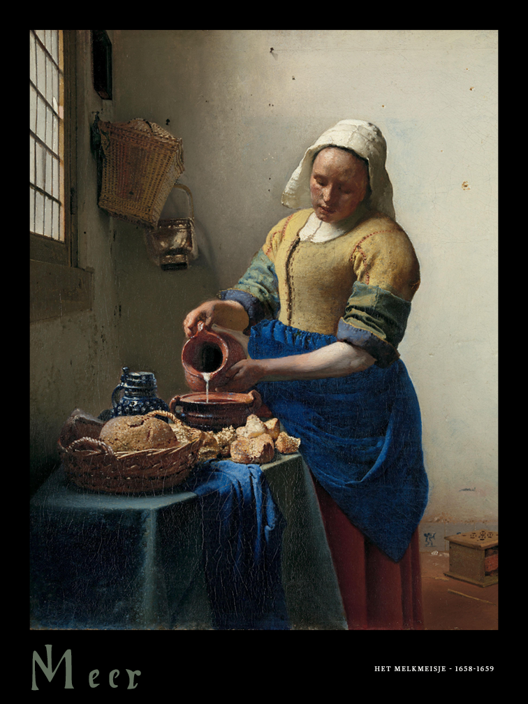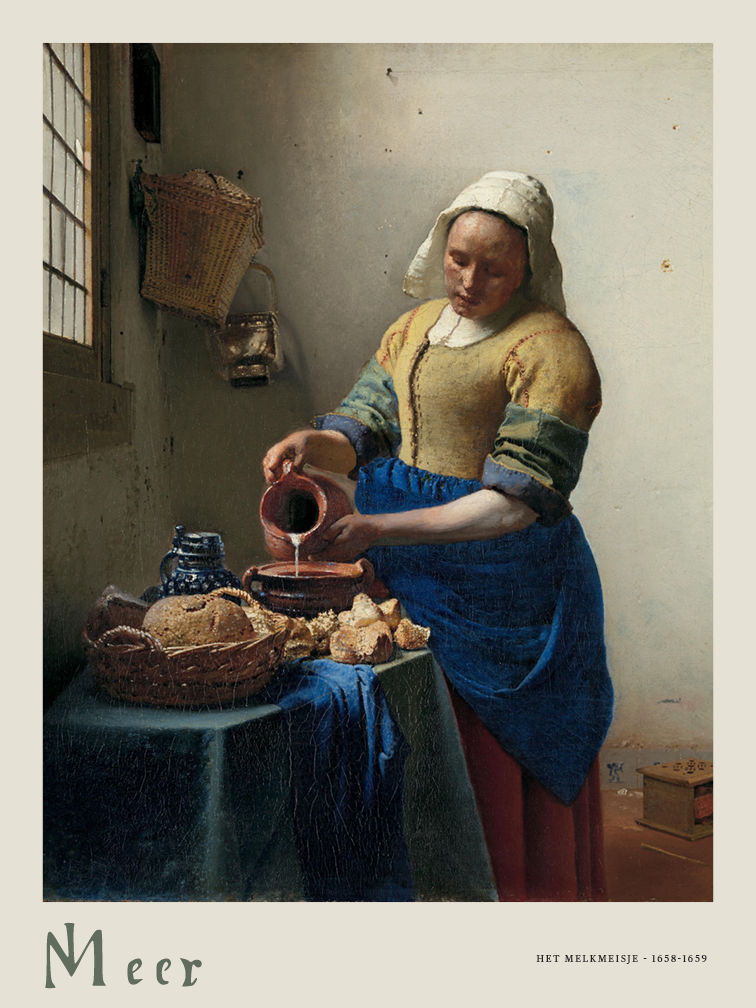 Deze poster van 30 x 40 cm toont Het Melkmeisje van Johannes Vermeer, geschilderd rond 1658-1659. Tijdens het werk schenkt een dienstmeisje melk in een schaal, omringd door vers brood en keukengerei. De originele handtekening van Vermeer is toegevoegd aan het ontwerp. De verfijnde details, het spel van licht en schaduw en de serene compositie maken dit werk tot een tijdloos meesterstuk.