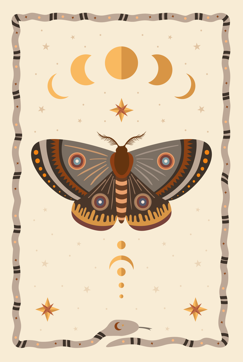 Deze bohemian poster van 20 x 30 cm toont een gestileerde nachtvlinder centraal in het beeld, omringd door de fasen van de maan. De nachtvlinder is opgebouwd uit warme oker-, bruin- en beige tinten. Langs de randen kronkelt een bruine slang met oranje strepen, wat het ontwerp een mystiek karakter geeft. De donkerpaarse achtergrond in combinatie met de warme bruine accenten creëert een sfeervol en spiritueel geheel.