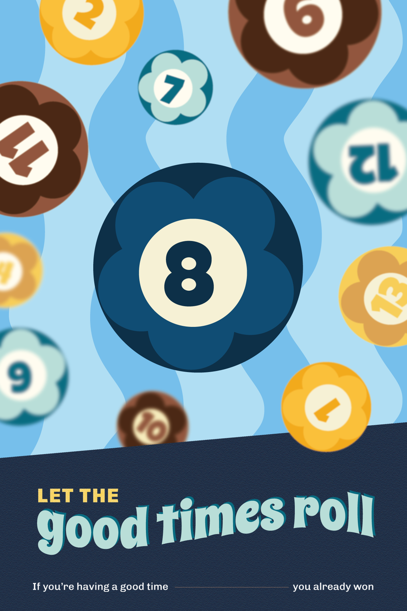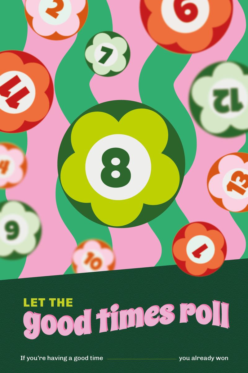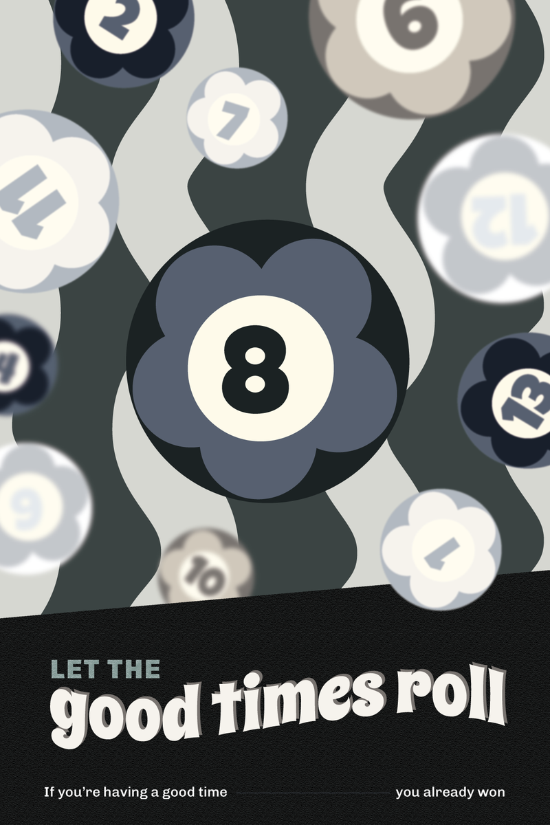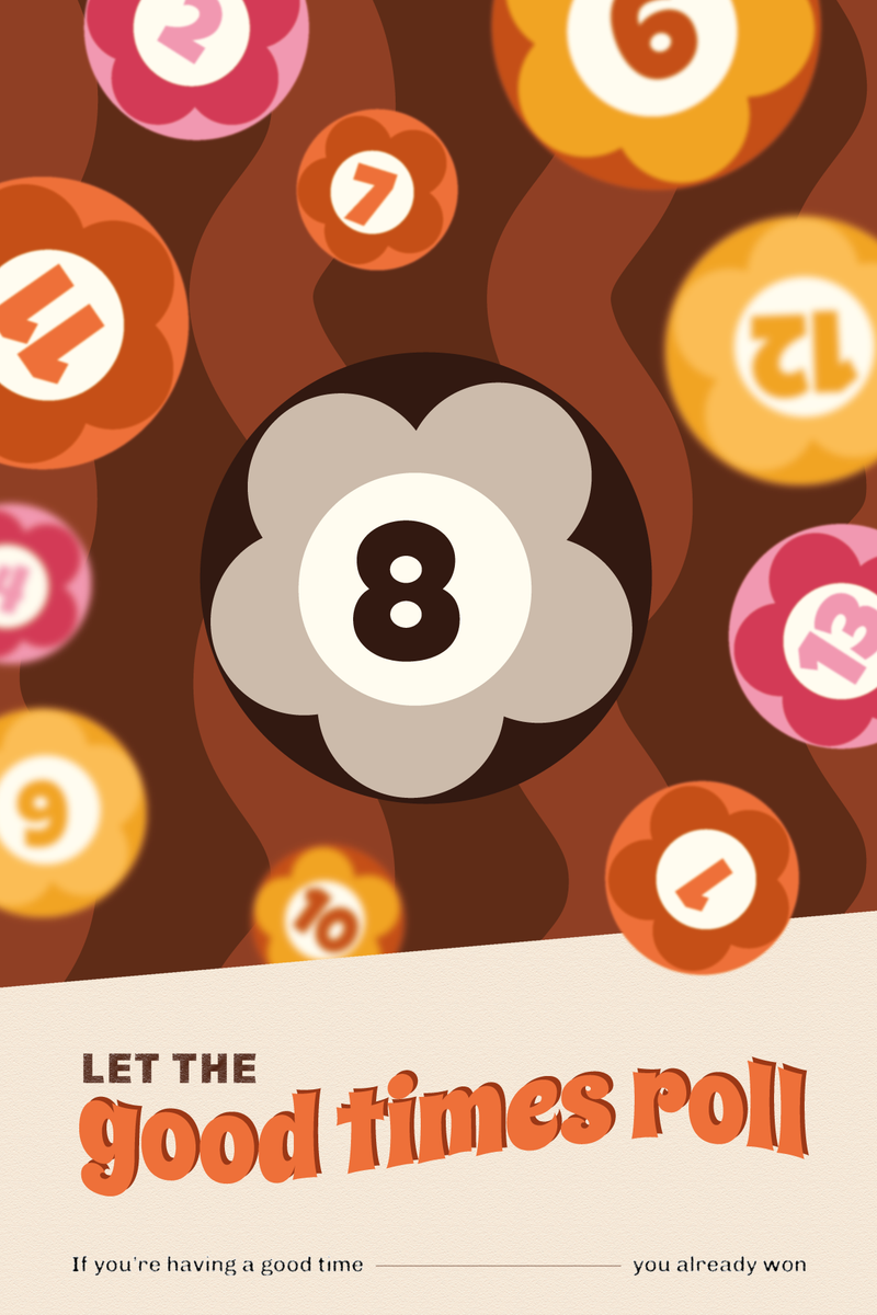 De iconische 8-ball staat centraal in dit speelse en retro-geïnspireerde ontwerp. Deze poster van 20 x 30 cm toont bloemvormige biljartballen met opvallende kleuren en cijfers. Het retro ontwerp wordt versterkt door een golvende achtergrond in paarse, roze en mosterdgele kleuren. De typerende tekst “Let the good times roll” geeft het geheel een optimistische en luchtige noot toe.