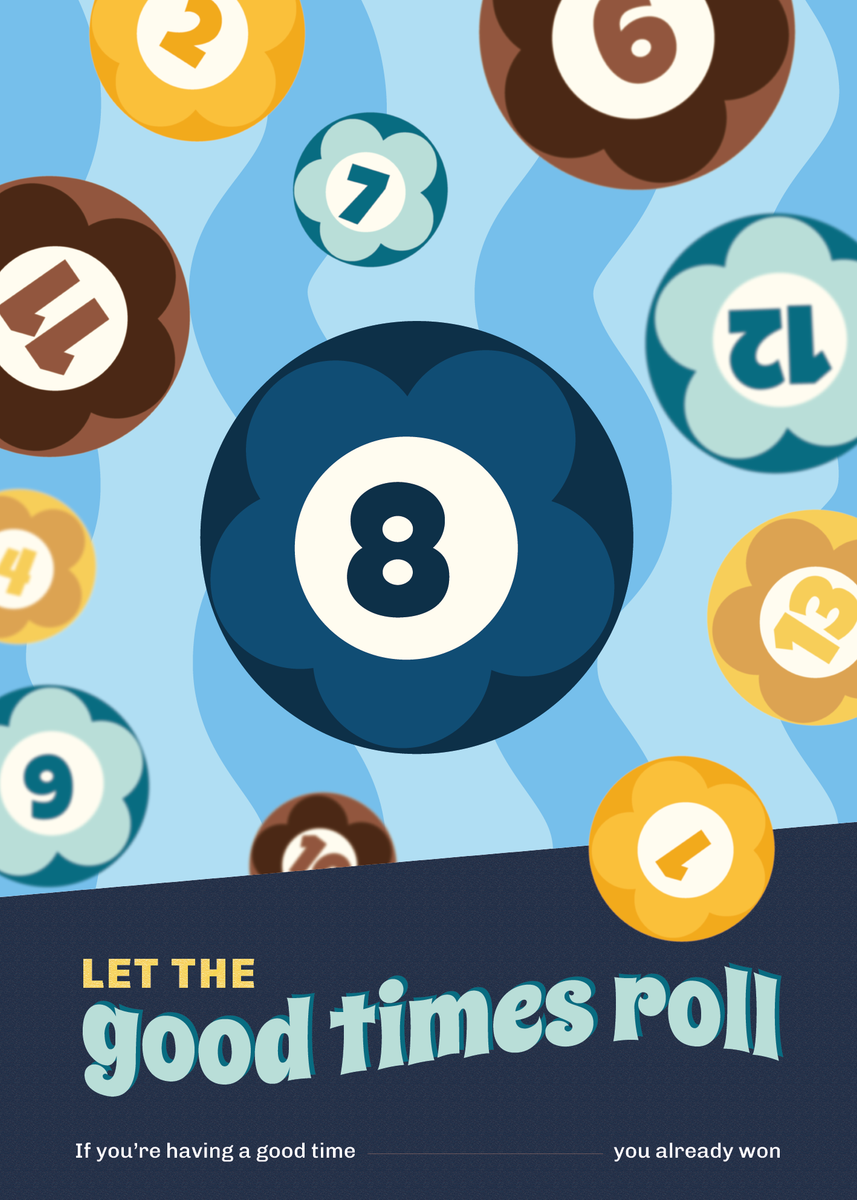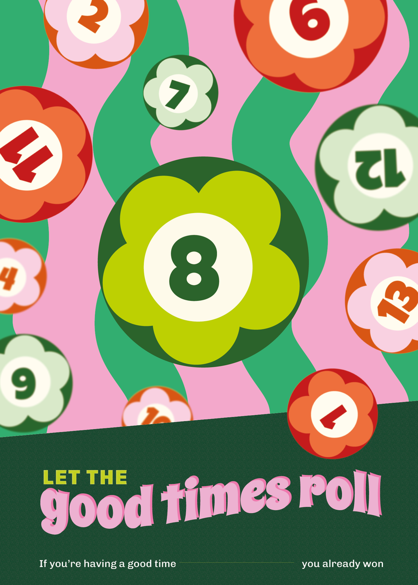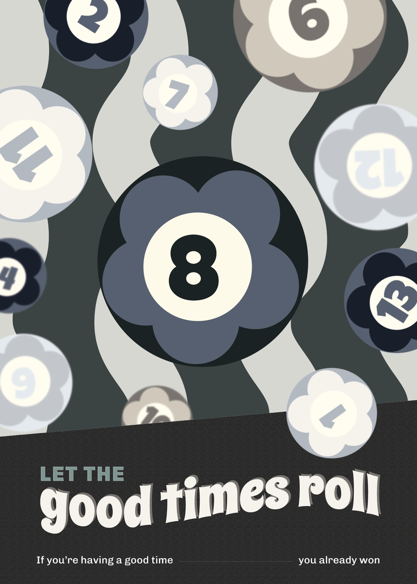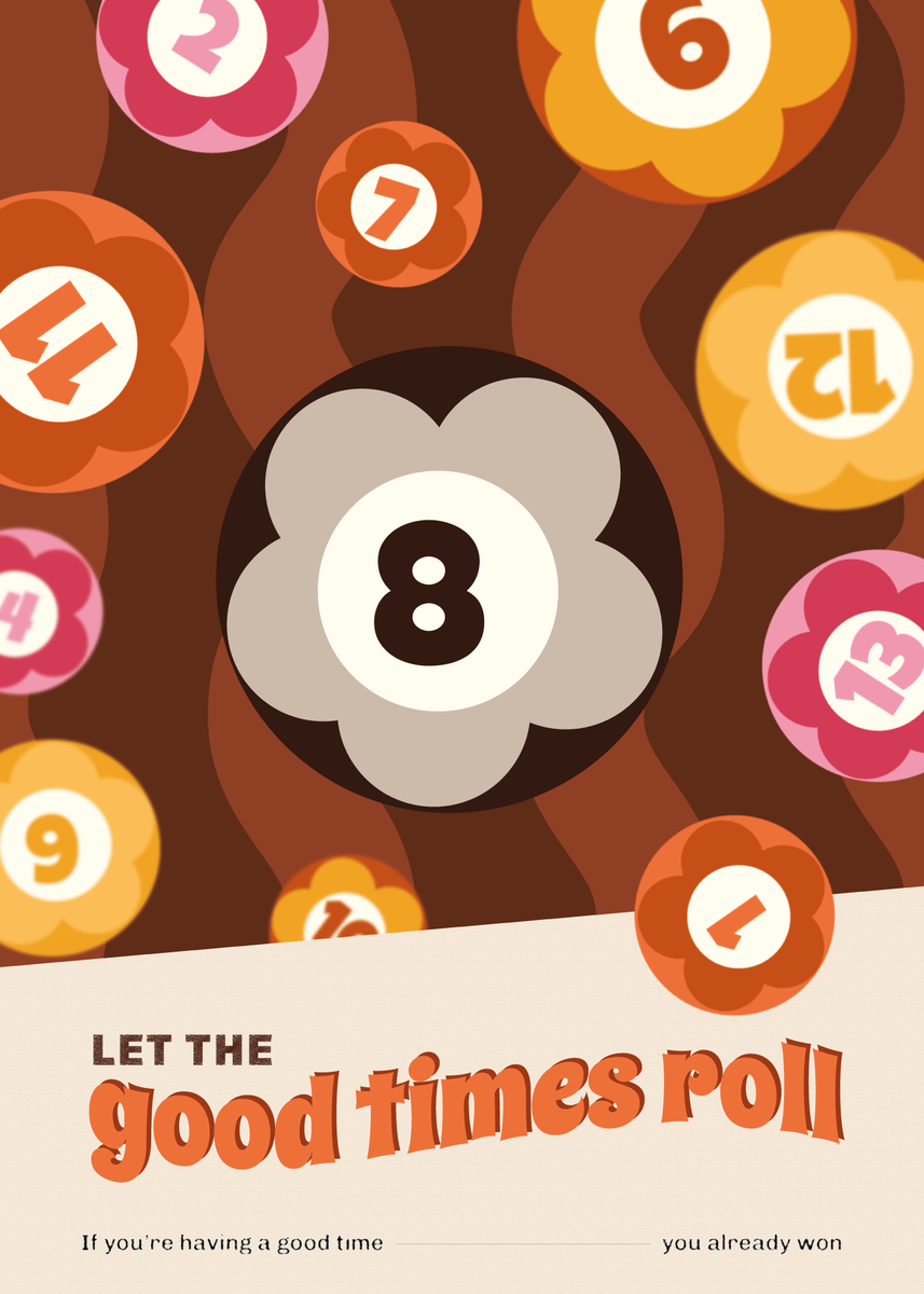 De iconische 8-ball staat centraal in dit speelse en retro-geïnspireerde ontwerp. Deze poster van 50 x 70 cm toont bloemvormige biljartballen met opvallende kleuren en cijfers. Het retro ontwerp wordt versterkt door een golvende achtergrond in paarse, roze en mosterdgele kleuren. De typerende tekst “Let the good times roll” geeft het geheel een optimistische en luchtige noot toe.