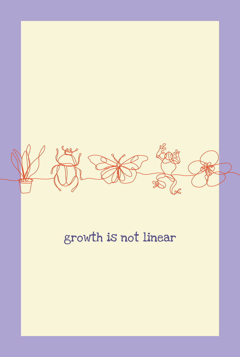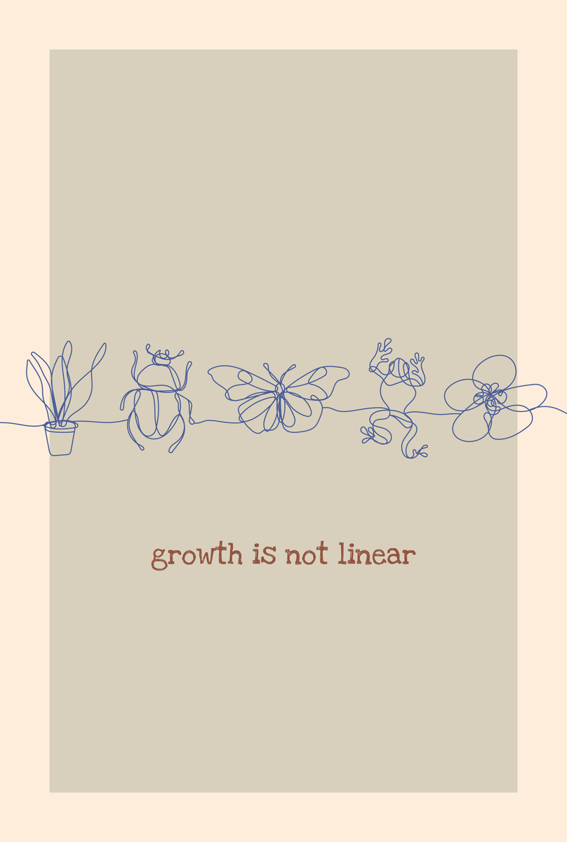 Deze minimalistische poster van 20 x 30 cm heeft een donkergroene achtergrond met een beige vlak en een subtiele lijntekening in een goude kleur. Het ontwerp toont een doorlopende lijn met een plant, kever, vlinder, kikker en bloem. De tekst ‘growth is not linear’ is uitgevoerd in een zachte okerkleur, wat het ontwerp een warme uitstraling geeft. Perfect voor wie een motiverend en stijlvol accent in huis wil toevoegen.