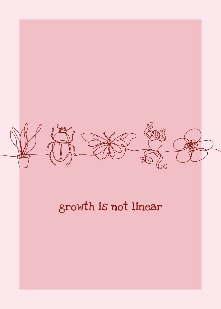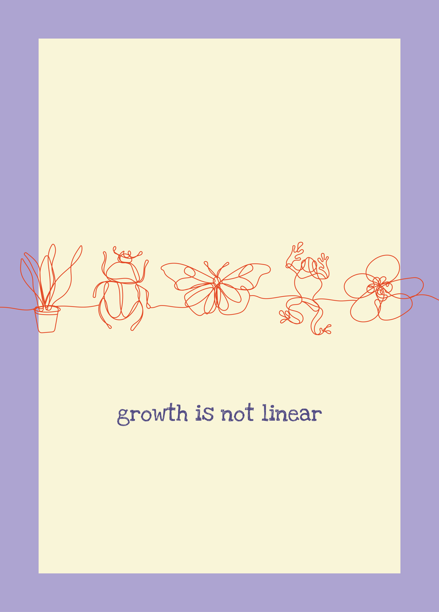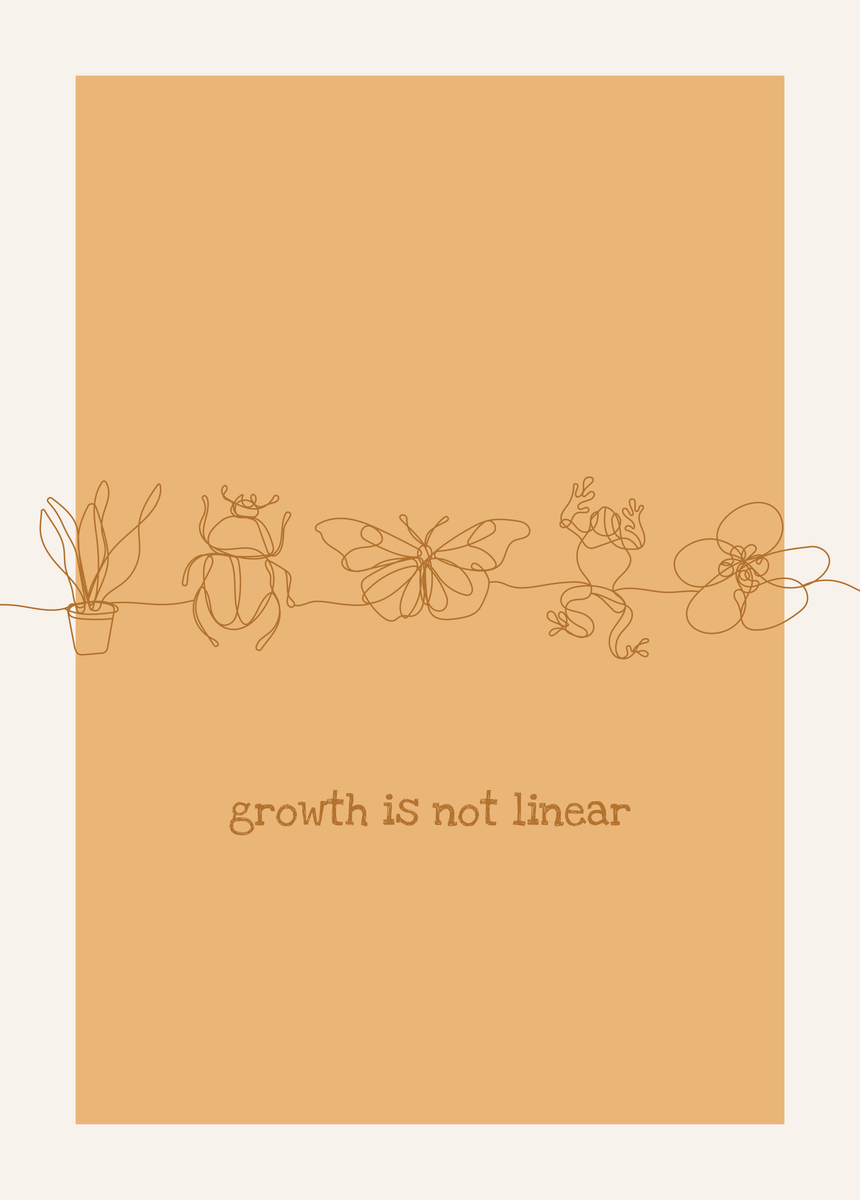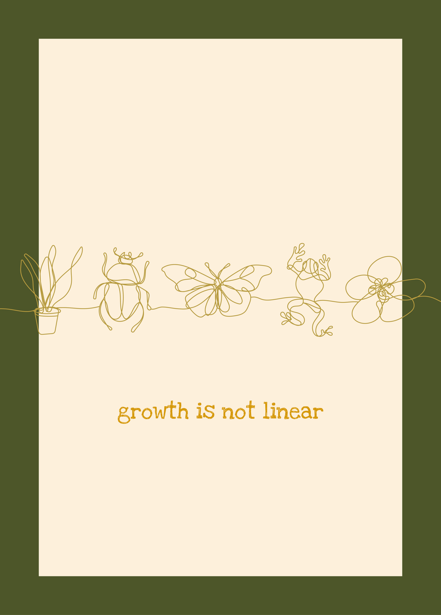 Deze minimalistische poster van 50 x 70 cm heeft een lichtgroene achtergrond met een beige kader, blauwe lijntekening en bruine quote: Growth is not linear. Het ontwerp toont een doorlopende lijn met een plant, kever, vlinder, kikker en bloem. Dit ontwerp herinnert je eraan dat vooruitgang niet altijd een rechte lijn is, maar een proces met ups en downs. Perfect voor wie een motiverend en stijlvol accent in huis wil toevoegen.