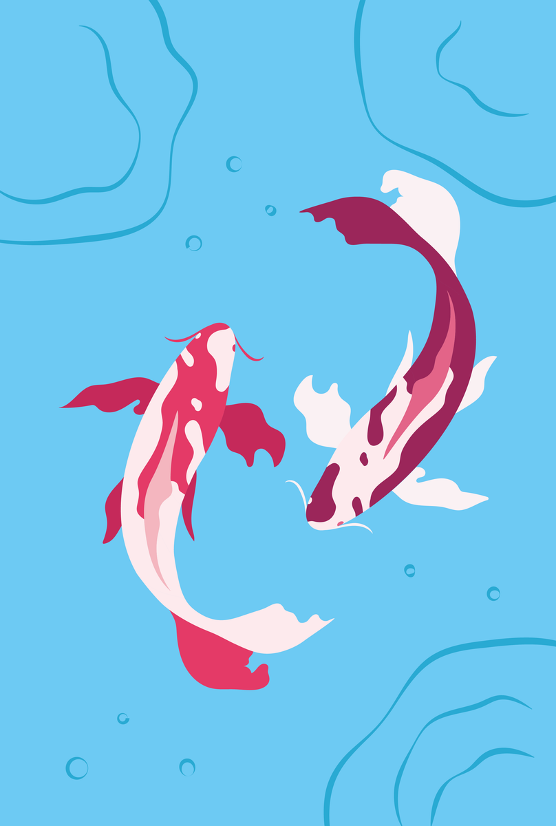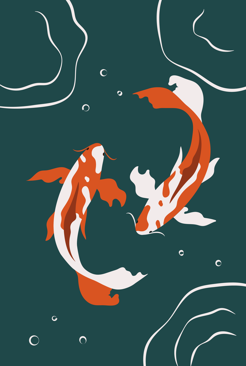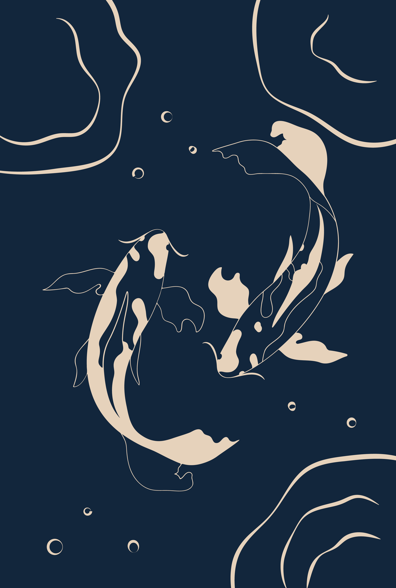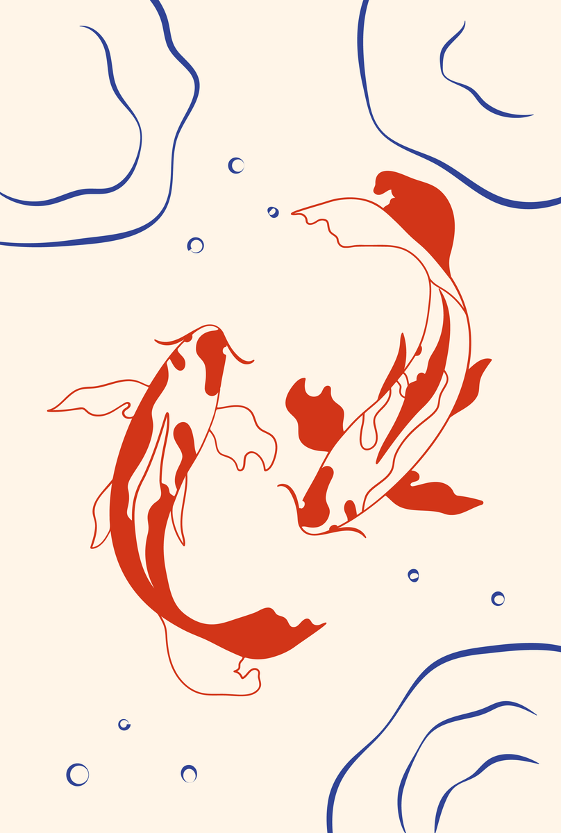 Deze minimalistische poster van 20 x 30 cm toont twee sierlijke koi vissen in rood en wit, zwemmend in een blauwe wateromgeving. De organische waterlijnen en subtiele luchtbellen geven extra details aan het ontwerp en versterken het speelse effect van het water. Dankzij de botanische invloeden past deze print perfect in een interieur met een rustgevende en natuurlijke sfeer.