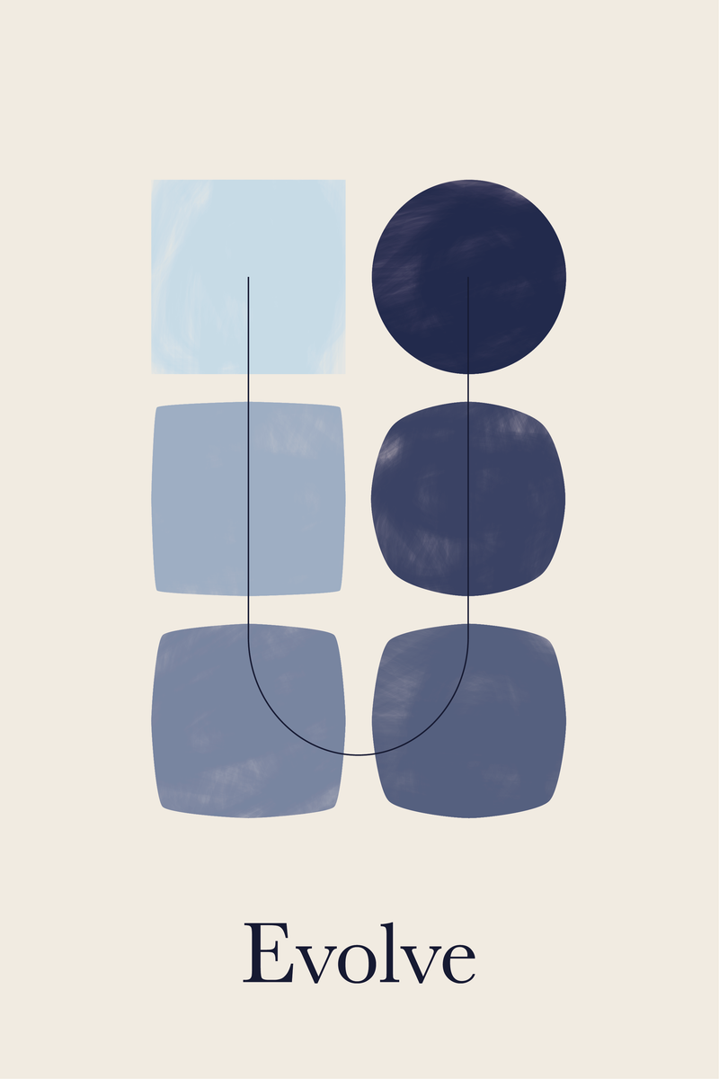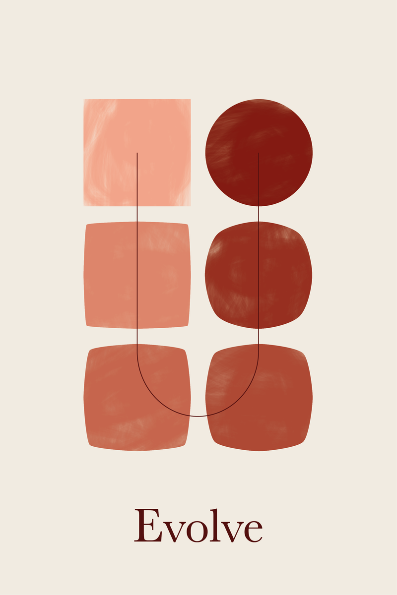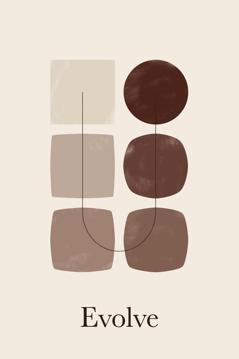 Deze minimalistische 20 x 30 cm poster verbeeldt een subtiele evolutie op een beige achtergrond. Een dunne lijn verbindt de figuren, die geleidelijk transformeren van vierkant naar cirkel, waarbij de hoeken zachter en ronder worden. Tegelijkertijd verandert de kleur van lichtgroen naar donkergroen, wat de overgang nog natuurlijker maakt. Onderaan wordt het ontwerp omschreven met het woord: Evolve.