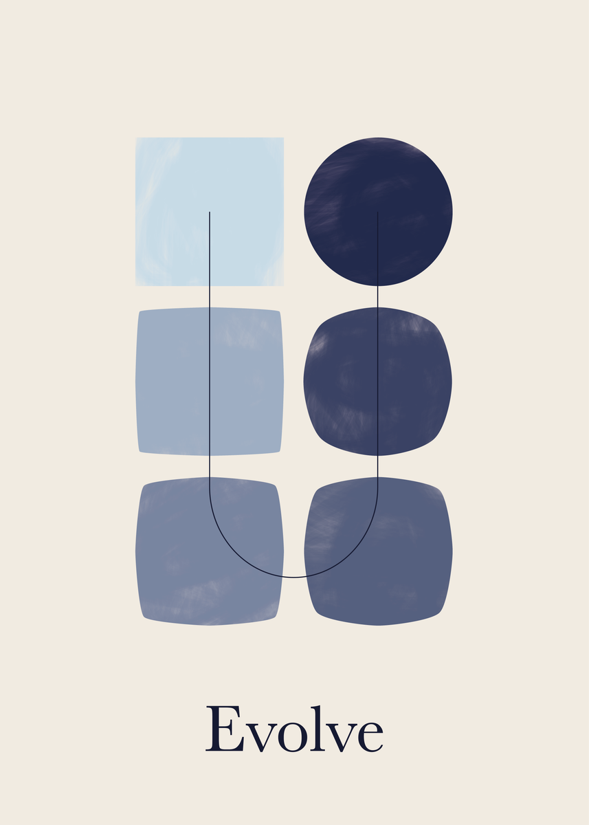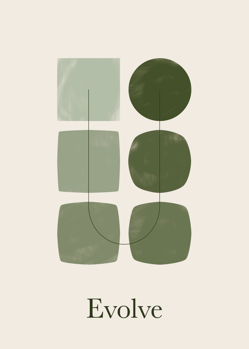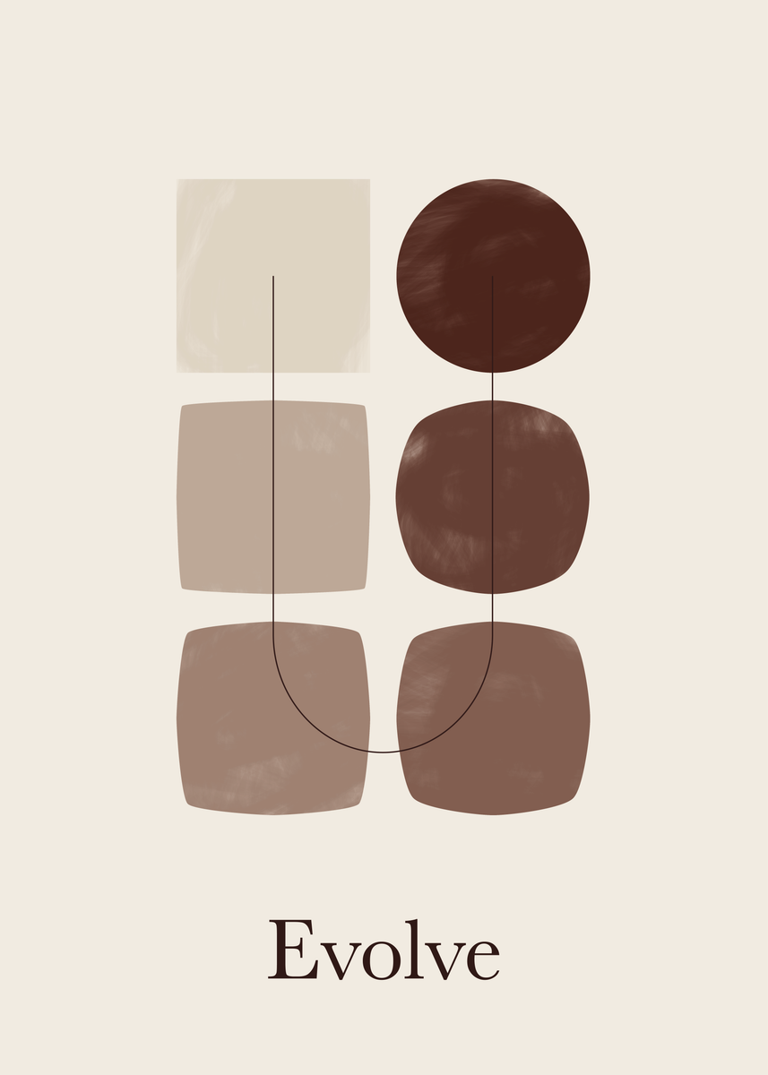Deze minimalistische 50 x 70 cm poster verbeeldt een subtiele evolutie op een beige achtergrond. Een dunne lijn verbindt de figuren, die geleidelijk transformeren van vierkant naar cirkel, waarbij de hoeken zachter en ronder worden. Tegelijkertijd verandert de kleur van een zachte perzik tint naar een roestbruine tint, wat de overgang nog natuurlijker maakt. Onderaan wordt het ontwerp omschreven met het woord: Evolve.