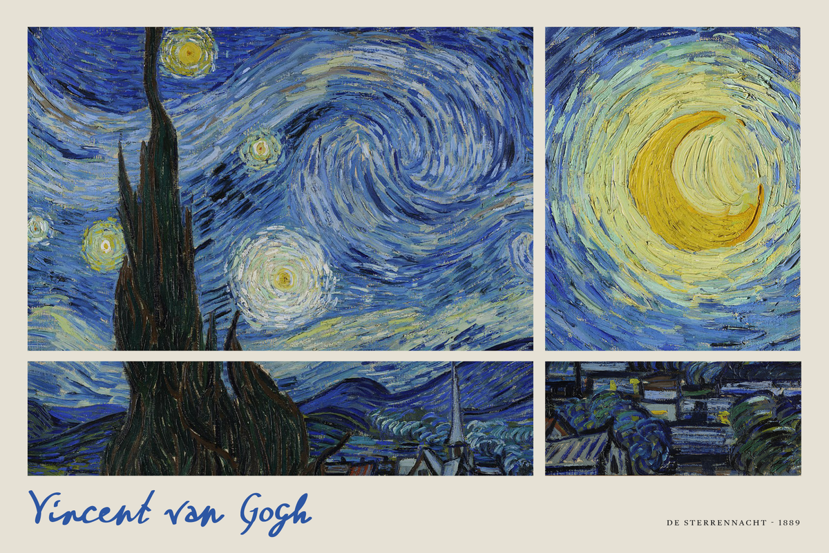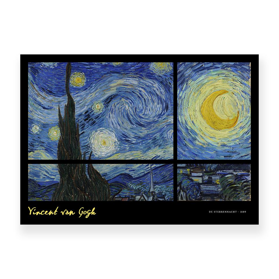 Deze poster van 30 x 20 toont een iconische sterrenhemel vol draaiende sterren en een opvallende cypres. Op de achtergrond zie je een rustig dorp met een kerktoren, omringd door glooiende heuvels. De combinatie van diepblauw en warmgeel zorgt voor een expressieve sfeer die perfect past in een klassiek of kunstzinnig interieur. Dit ontwerp heeft een originele handtekening van de oude-meester.