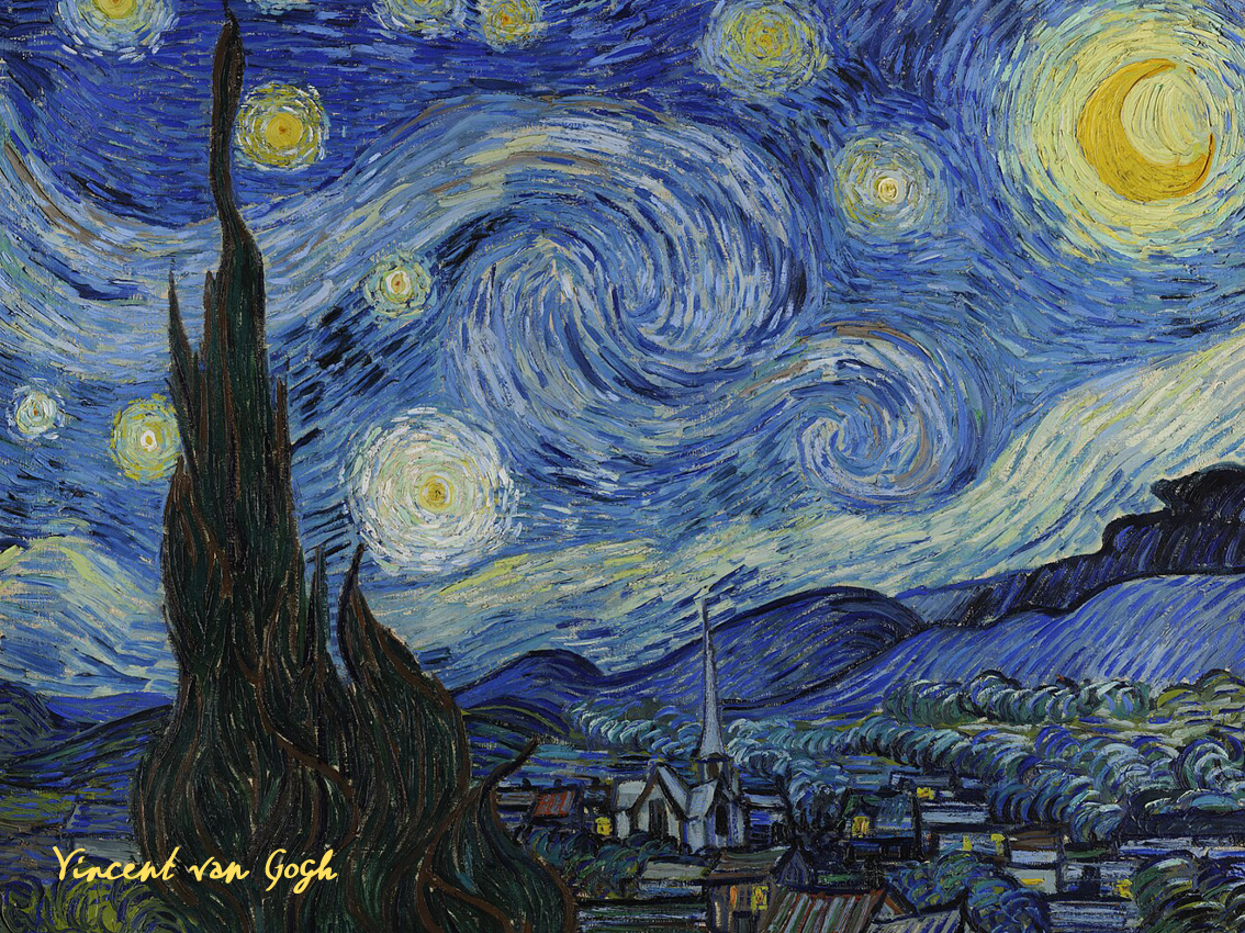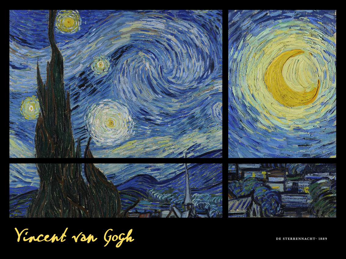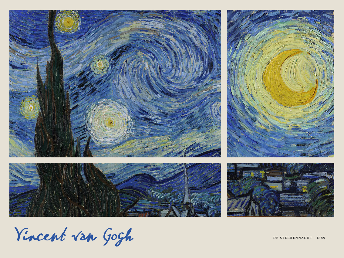 Deze poster van 40 x 30 toont een iconische sterrenhemel vol draaiende sterren en een opvallende cypres. Op de achtergrond zie je een rustig dorp met een kerktoren, omringd door glooiende heuvels. De combinatie van diepblauw en warmgeel zorgt voor een expressieve sfeer die perfect past in een klassiek of kunstzinnig interieur. Dit ontwerp heeft een witte rand met daarin de originele handtekening van de oudmeester.
