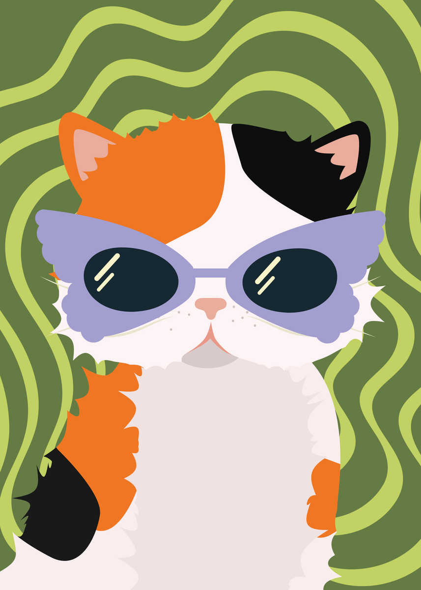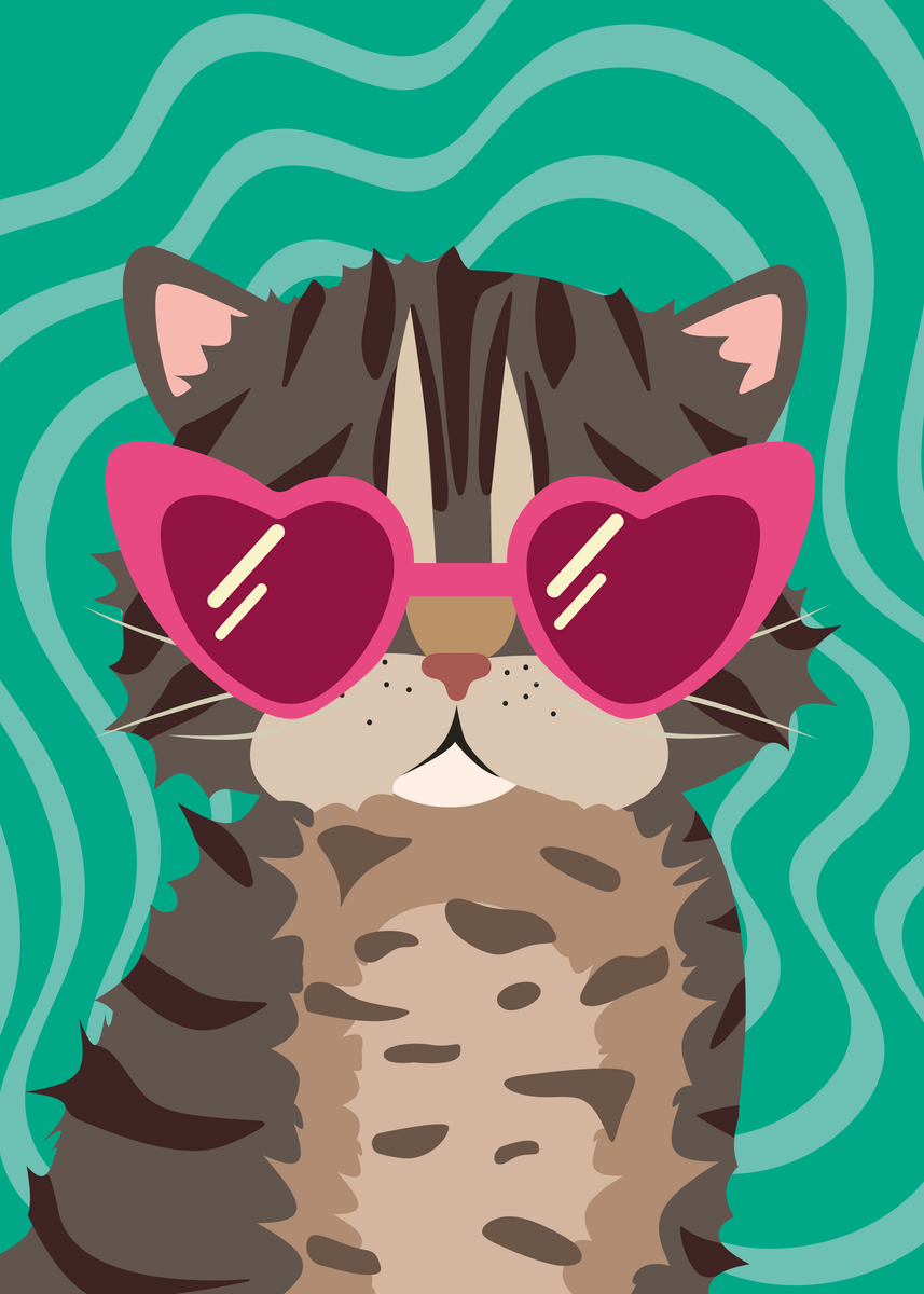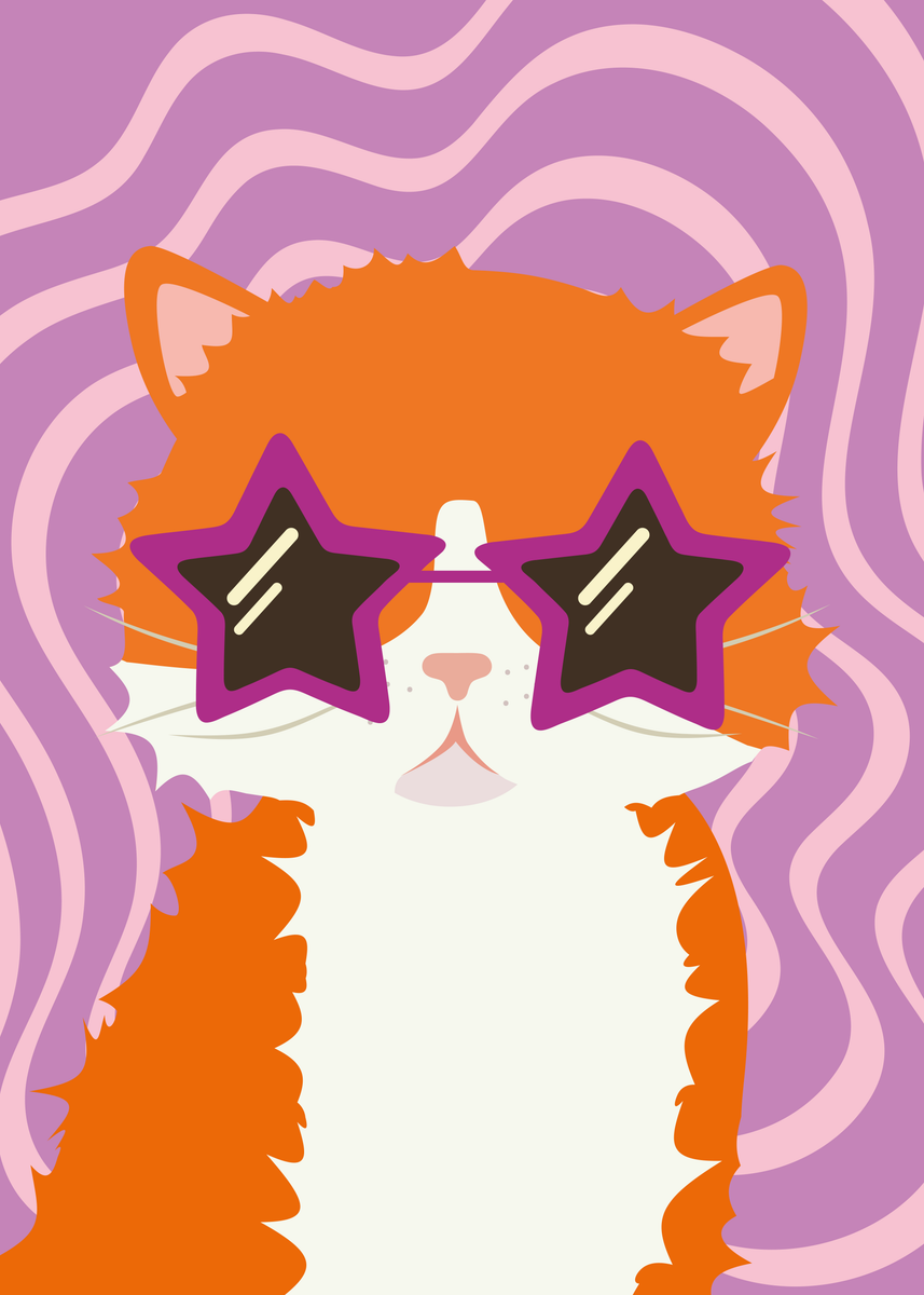 Deze speelse poster van 50 x 70 cm toont een witte kat met rode zonnebril. De roze achtergrond met rode lijnen versterkt het vrolijke en luchtige karakter van het ontwerp. De combinatie van humor, kleur en eenvoud sluit perfect aan bij de dopamine decor-trend: een stijl waarbij positiviteit en expressieve vormen centraal staan. De poster voegt een optimistische en opvallende touch toe aan elk interieur.
