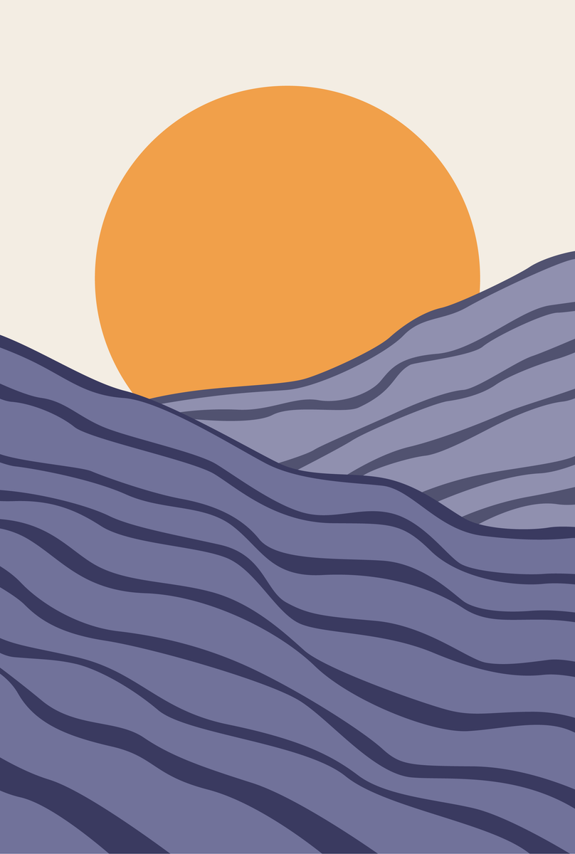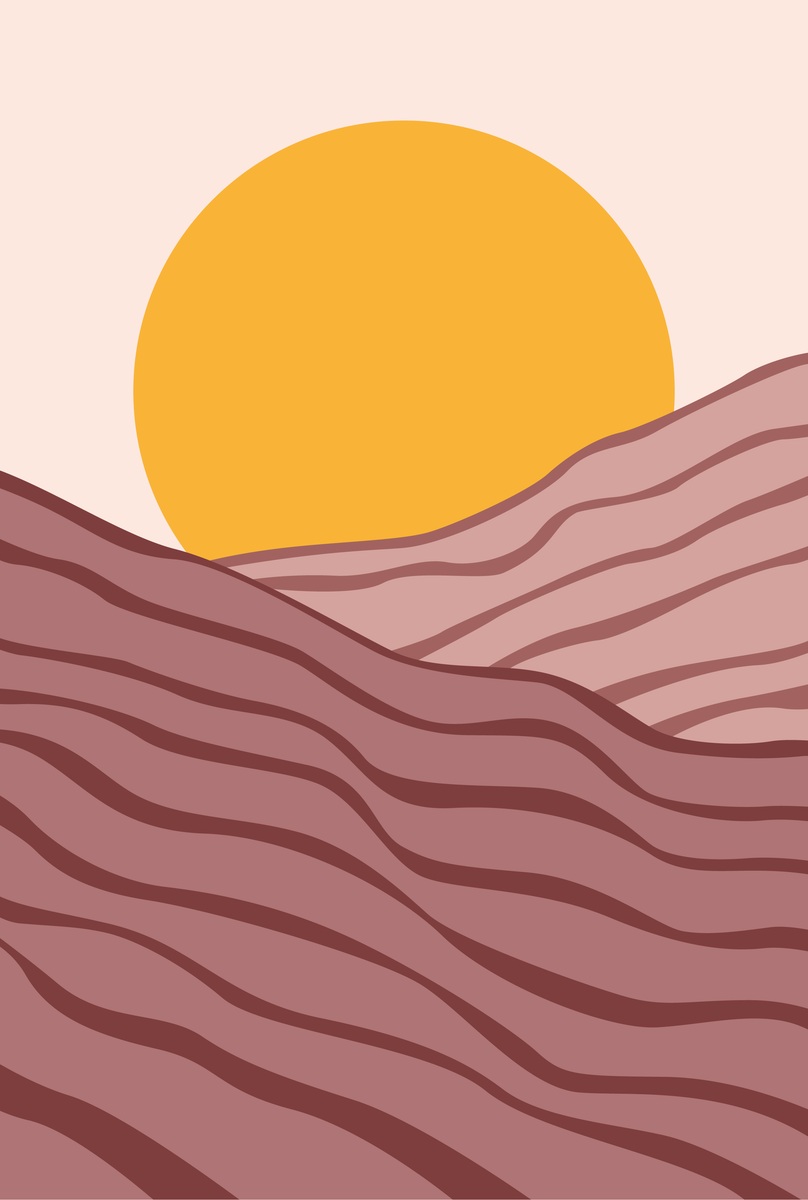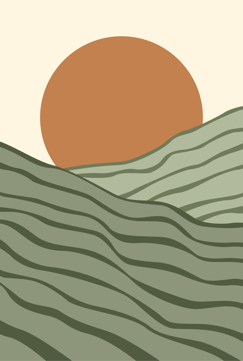Waar de zon ondergaat, begint een nieuw begin! Deze 20 x 30 cm poster toont een serene zonsondergang boven een golvend heuvellandschap. De zon, een karamelbruine cirkel, rijst op of zakt weg achter de gestapelde heuvels, die in verschillende tinten bruin gelaagdheid creëren tegen een licht ivoren achtergrond.