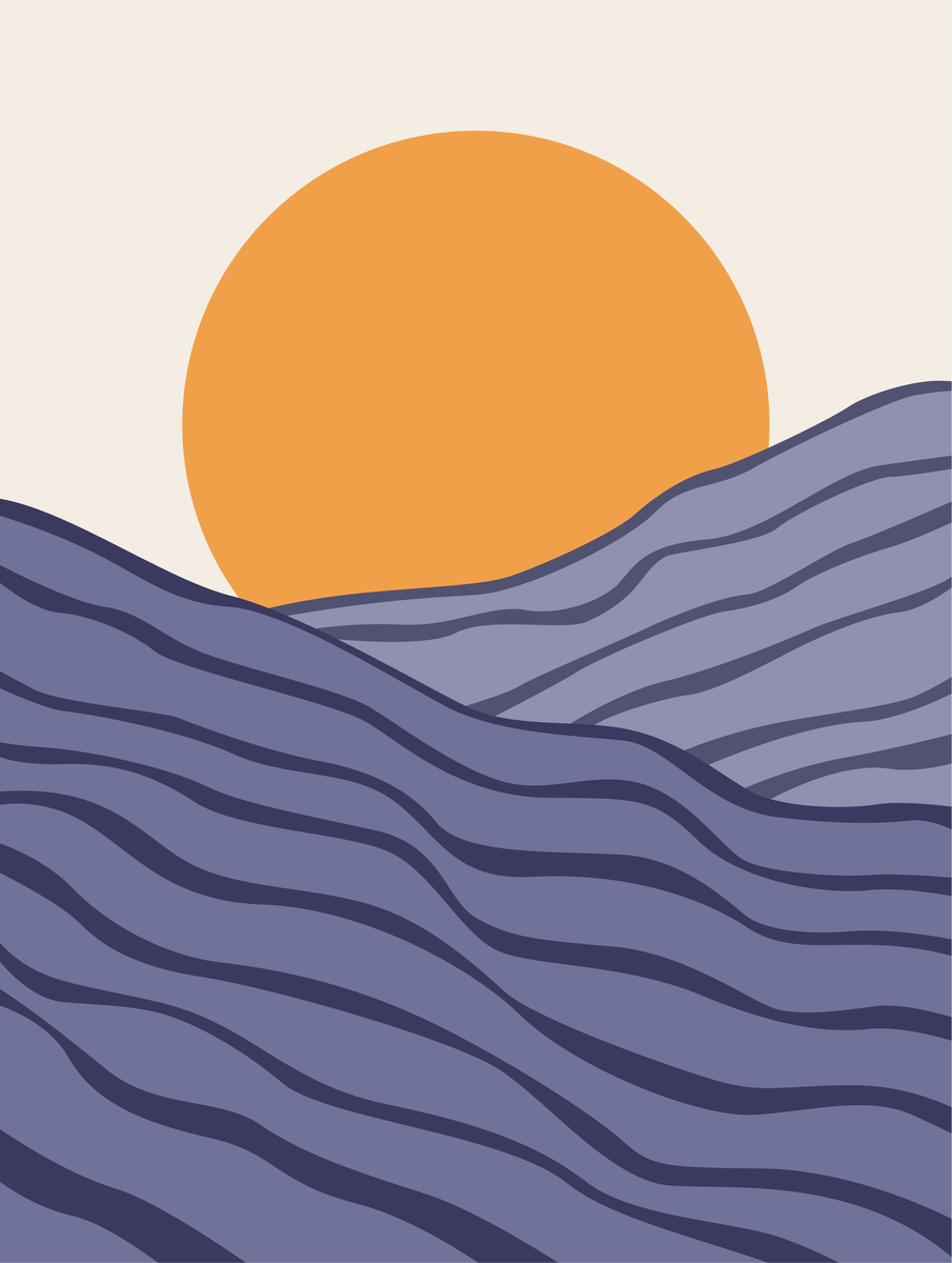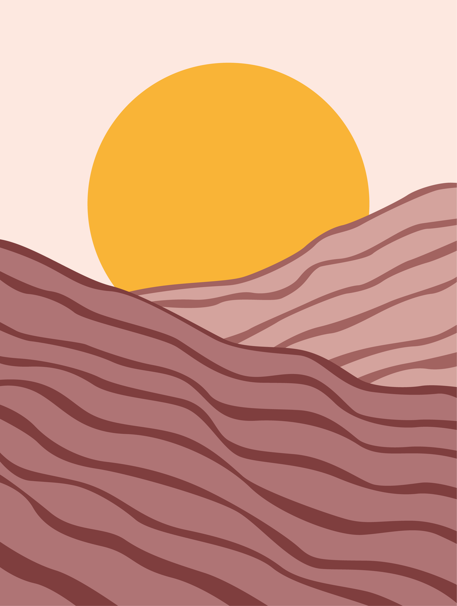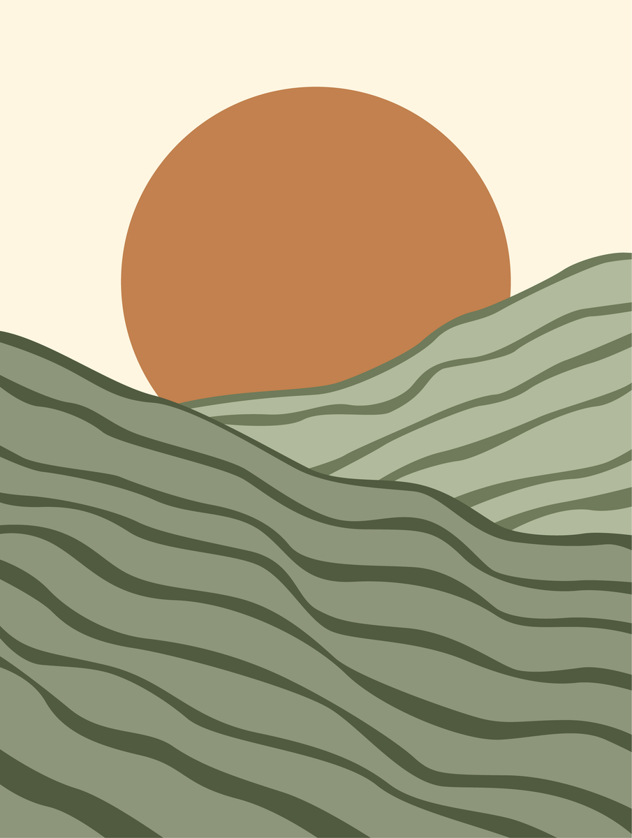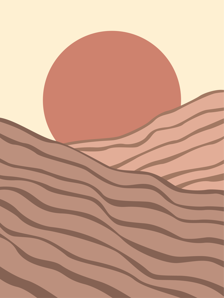 Waar de zon ondergaat, begint een nieuw begin! Deze 30 x 40 cm poster toont een serene zonsondergang boven een golvend heuvellandschap. De zon, een karamelbruine cirkel, rijst op of zakt weg achter de gestapelde heuvels, die in verschillende tinten bruin gelaagdheid creëren tegen een licht ivoren achtergrond.