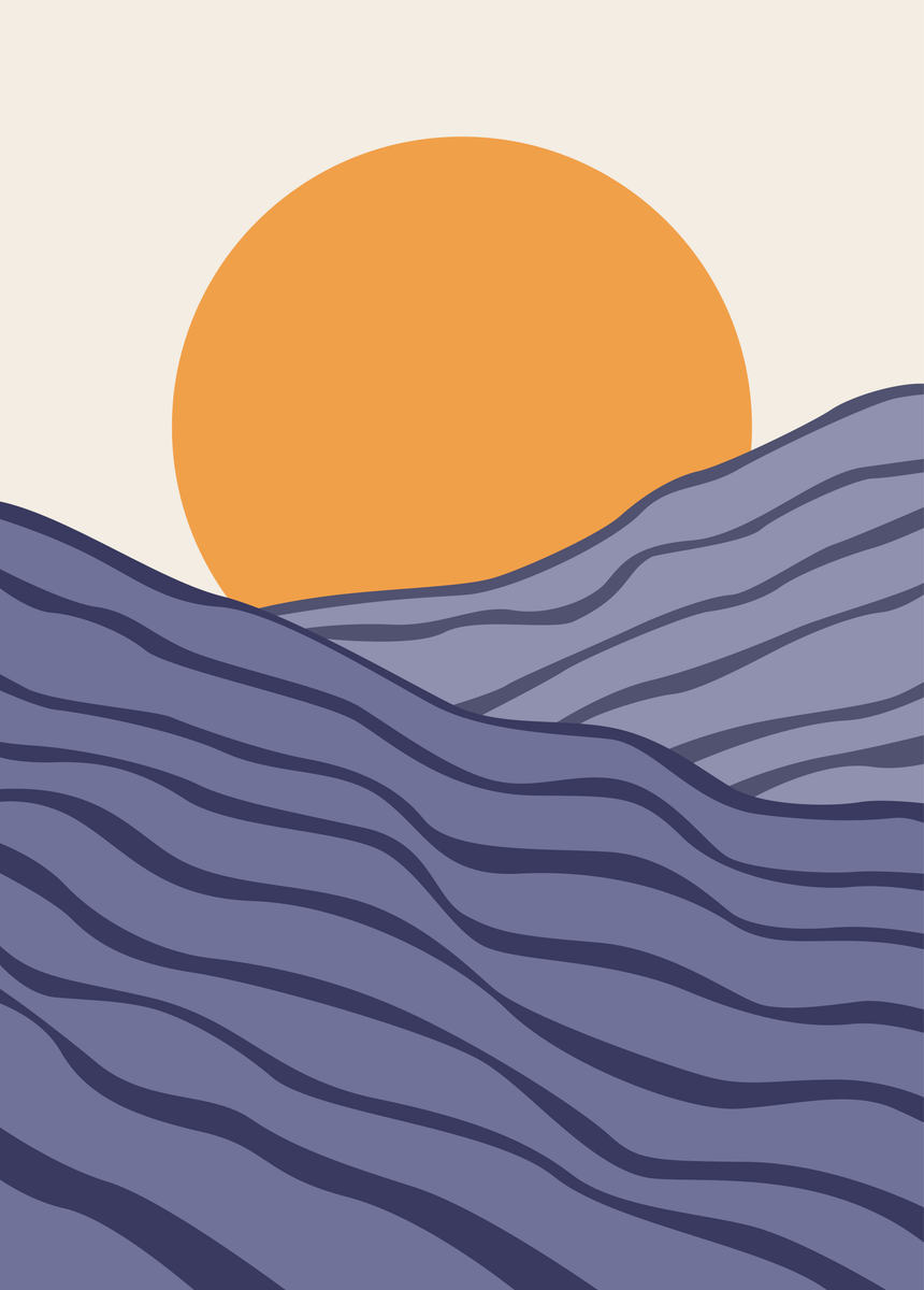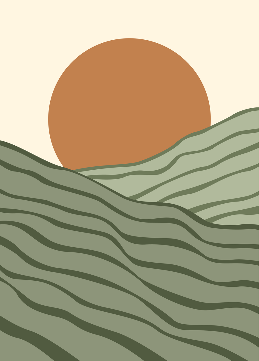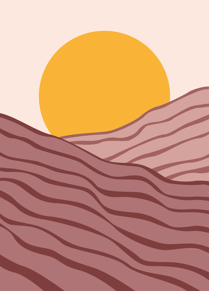 Waar de zon ondergaat, begint een nieuw begin! Deze 50 x 70 cm poster toont een serene zonsondergang boven een golvend heuvellandschap. De zon, een karamelbruine cirkel, rijst op of zakt weg achter de gestapelde heuvels, die in verschillende tinten bruin gelaagdheid creëren tegen een licht ivoren achtergrond.