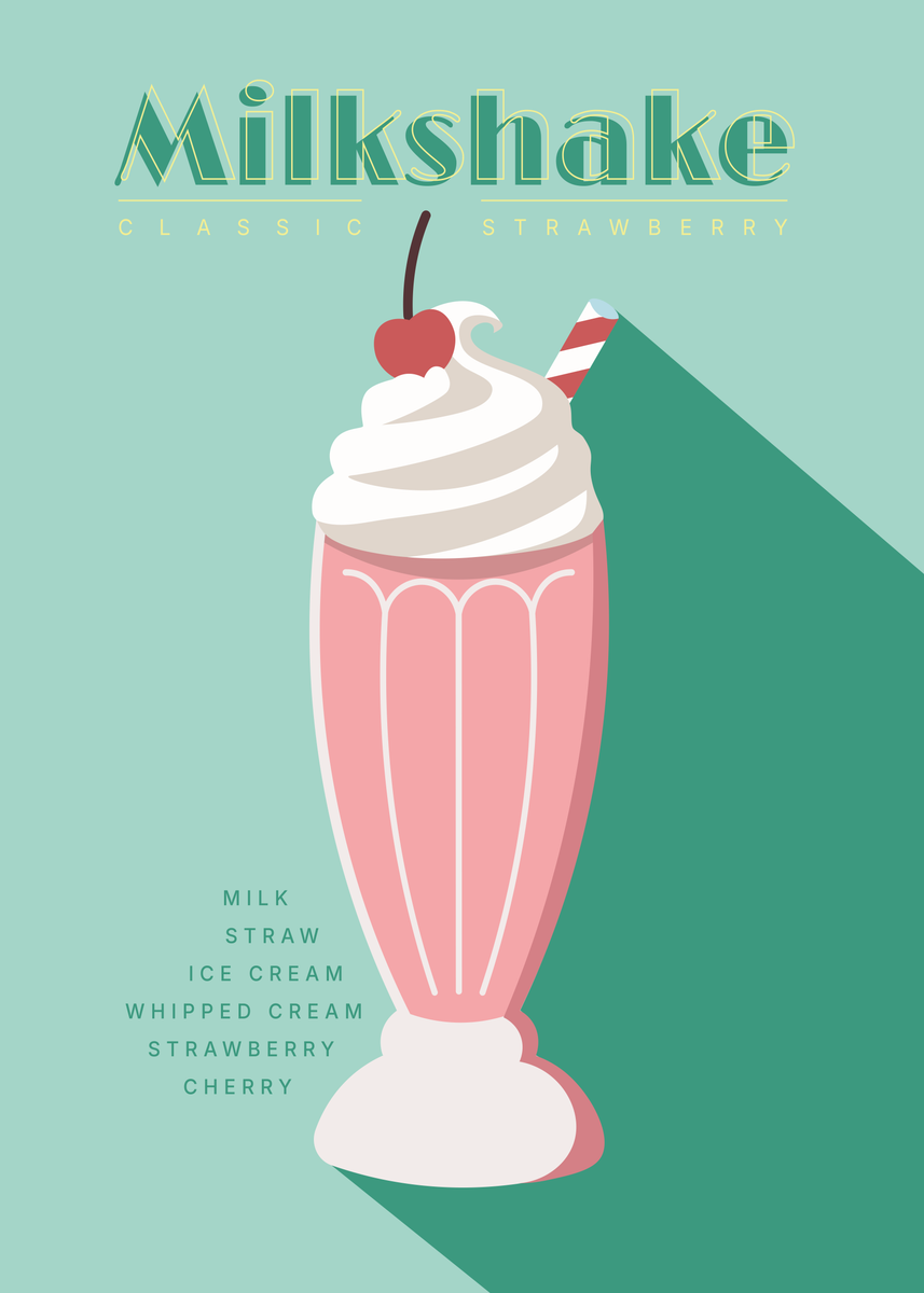 Breng een vleugje nostalgie in jouw interieur met deze retro poster van 50 x 70 cm. Het kleurrijke ontwerp brengt een romige bananenmilkshake tot leven in een elegant geel glas, afgetopt met luchtige slagroom, een stukje banaan en een rood-wit gestreept rietje. De lichtblauwe achtergrond versterkt de vintage diner-look, waardoor deze poster perfect past in keukens, cafés of bij liefhebbers van klassieke Amerikaanse esthetiek.