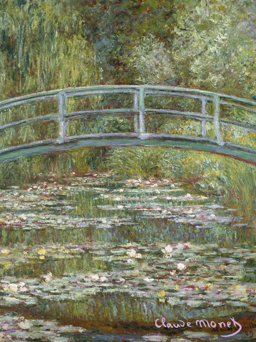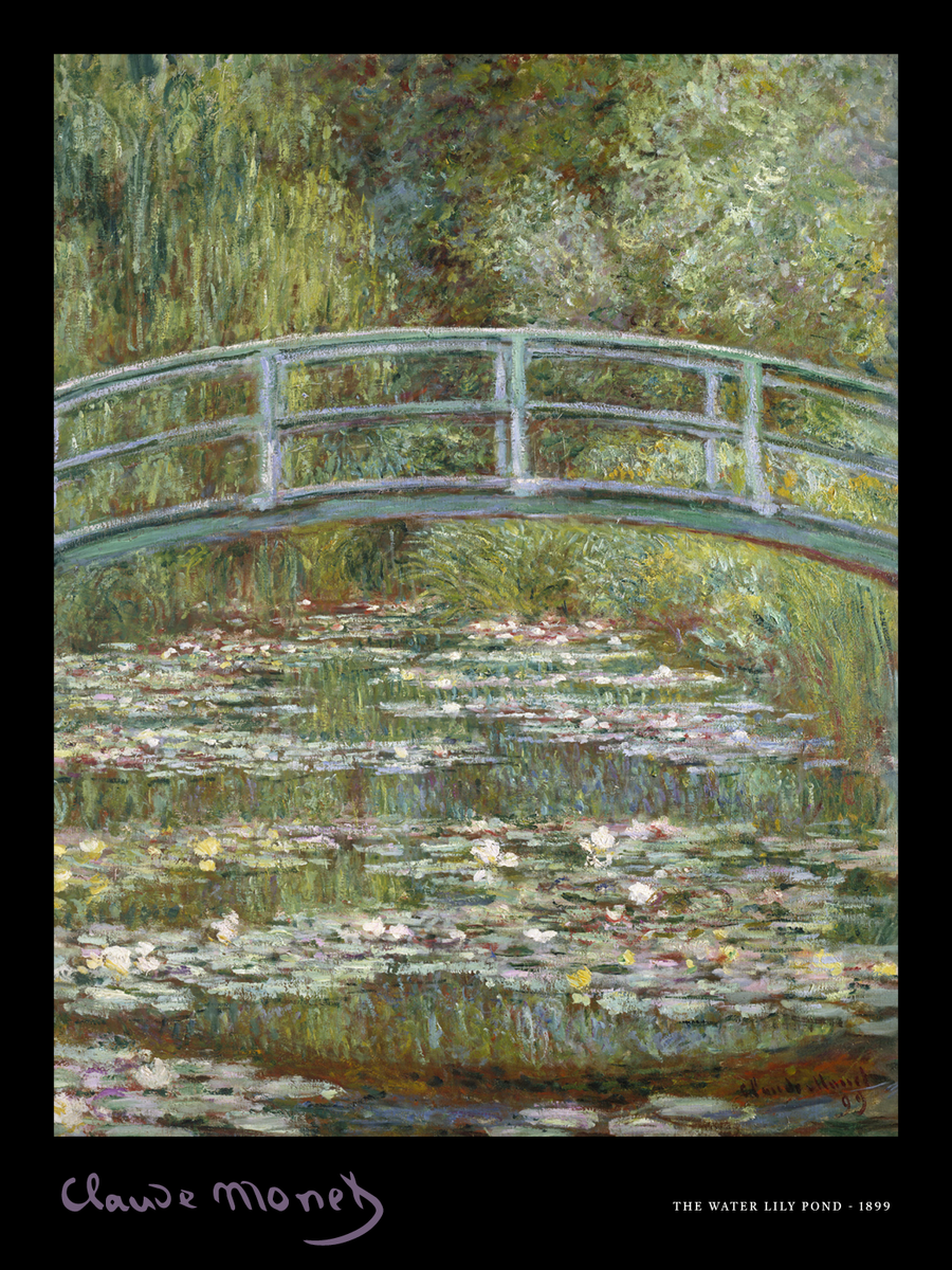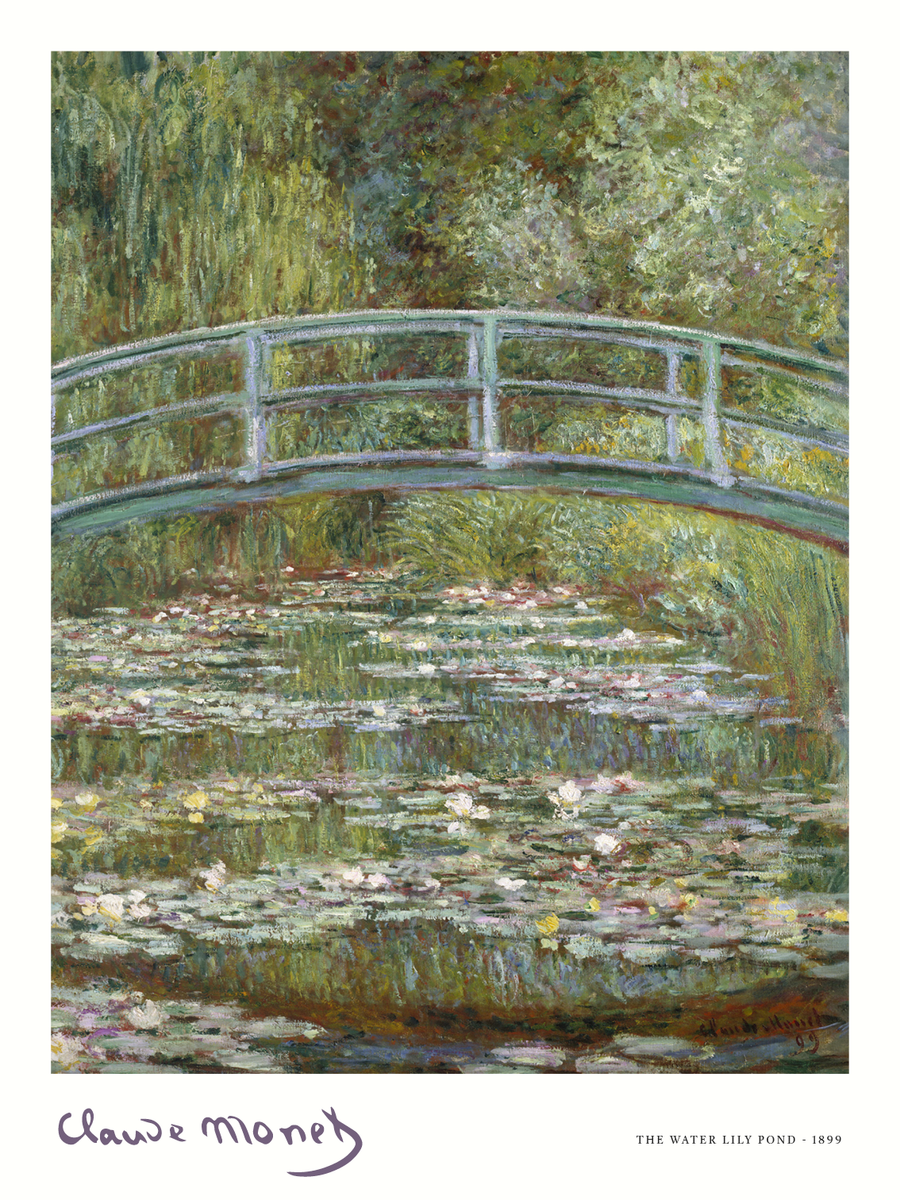 Deze poster van 30 x 40 cm toont The Water Lily Pond van Claude Monet uit 1899. Aan de onderkant van het ontwerp is de originele handtekening van deze meester toegevoegd. Centraal in het beeld zie je een karakteristieke, houten brug boven een vijver vol waterlelies, omgeven door groene begroeiing. Dit kunstwerk zorgt met zijn zachte beige achtergrond en impressionistische penseelstreken voor een rustgevende, natuurlijke sfeer in jouw interieur.