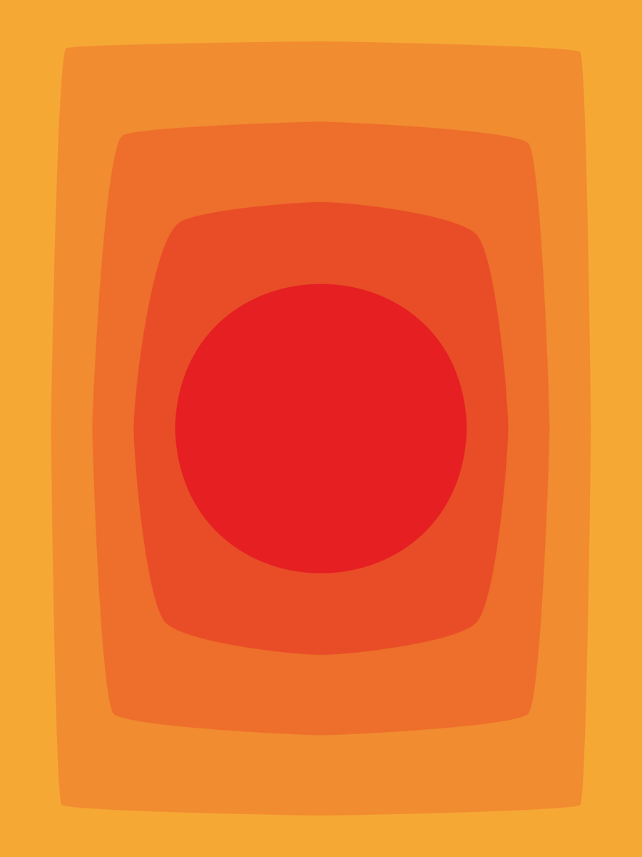 Deze abstracte poster van 30 x 40 cm toont een gelaagd ontwerp met afgeronde vierkanten met een cirkel in het midden. Deze vormen zijn opgebouwd uit warme oranjetinten, die geleidelijk overlopen in aardse groentinten. De kleurverlopen geven het ontwerp een vintage uitstraling met invloeden uit de Op-Art stroming. De kleurovergangen en dynamische compositie zorgen voor een sfeervolle toevoeging aan je interieur.